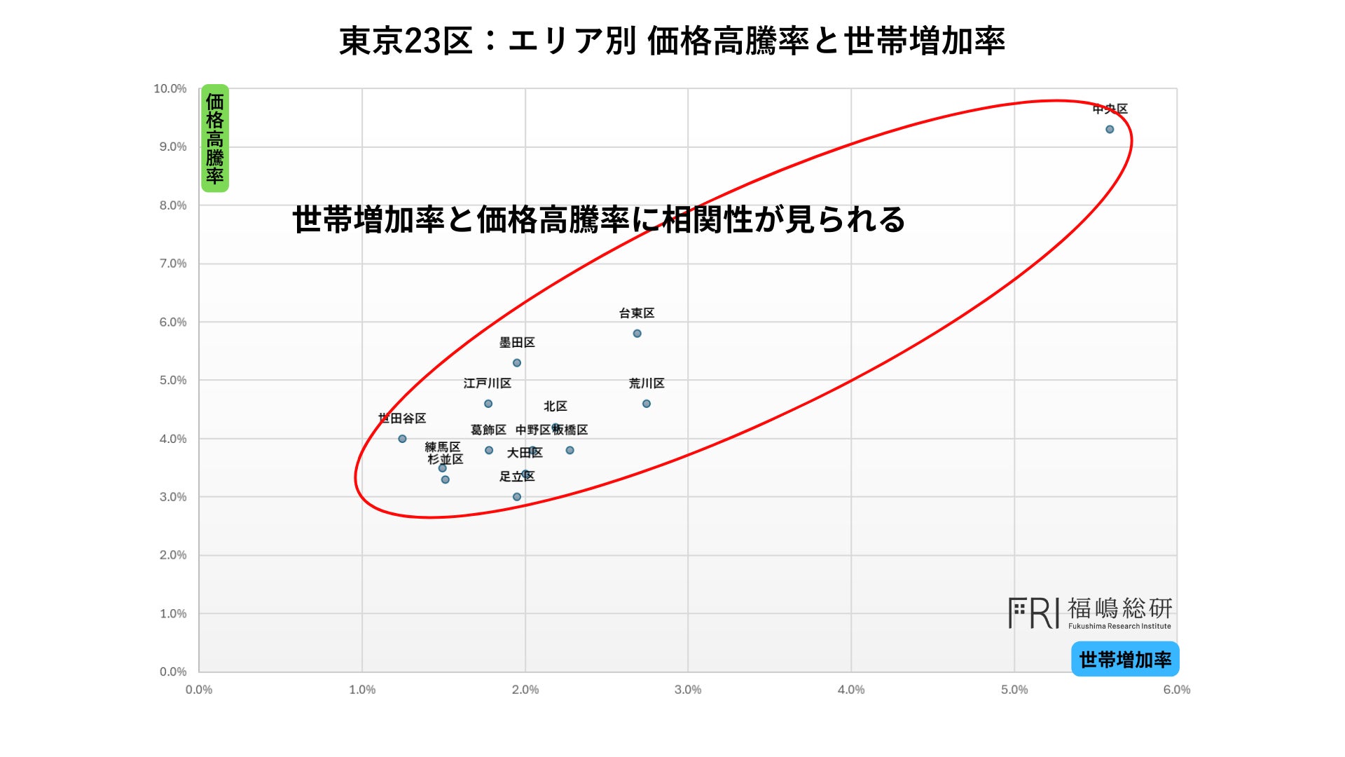 以下のグラフのプロットは東京都23区各エリア毎の世帯増加率とマンション価格の高騰率の関係を示しています。