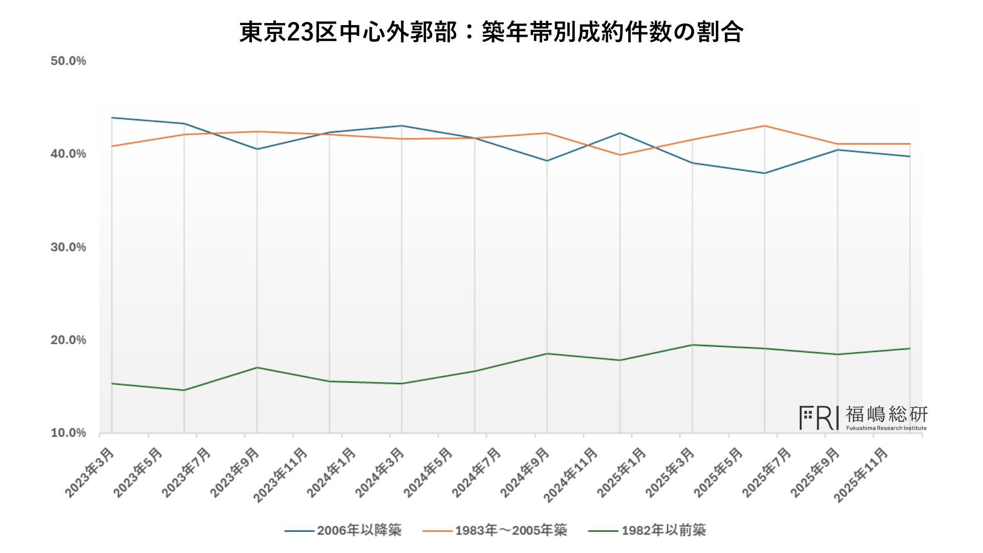 次に、これら太枠内エリアにおける築年帯別の成約件数割合の推移を見ると、極めて特徴的な傾向が確認されます。とりわけ、築20年未満の物件が占める成約件数の割合が非常に高く、他のエリアと比較しても際立った水準にあります。