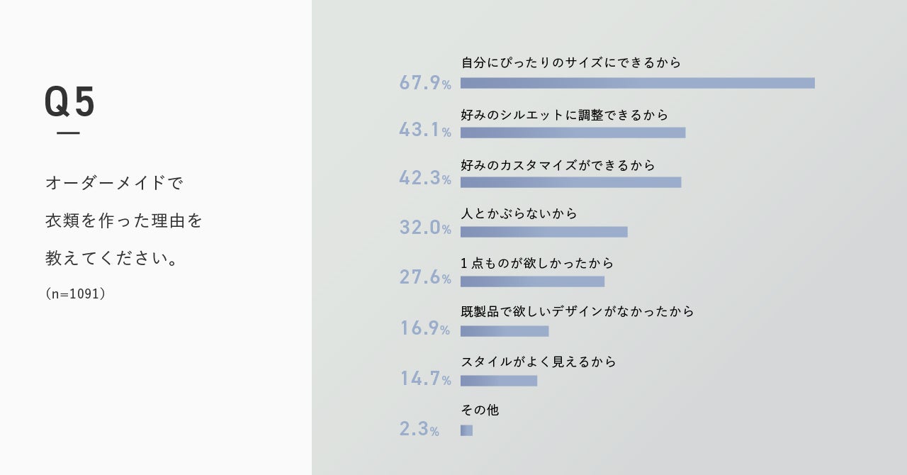 オーダーメイドで衣服を作った理由は、「自分にぴったりのサイズにできるから」がおよそ7割で、「好みのシルエットにできる」「好みのカスタマイズができる」と続きます。
