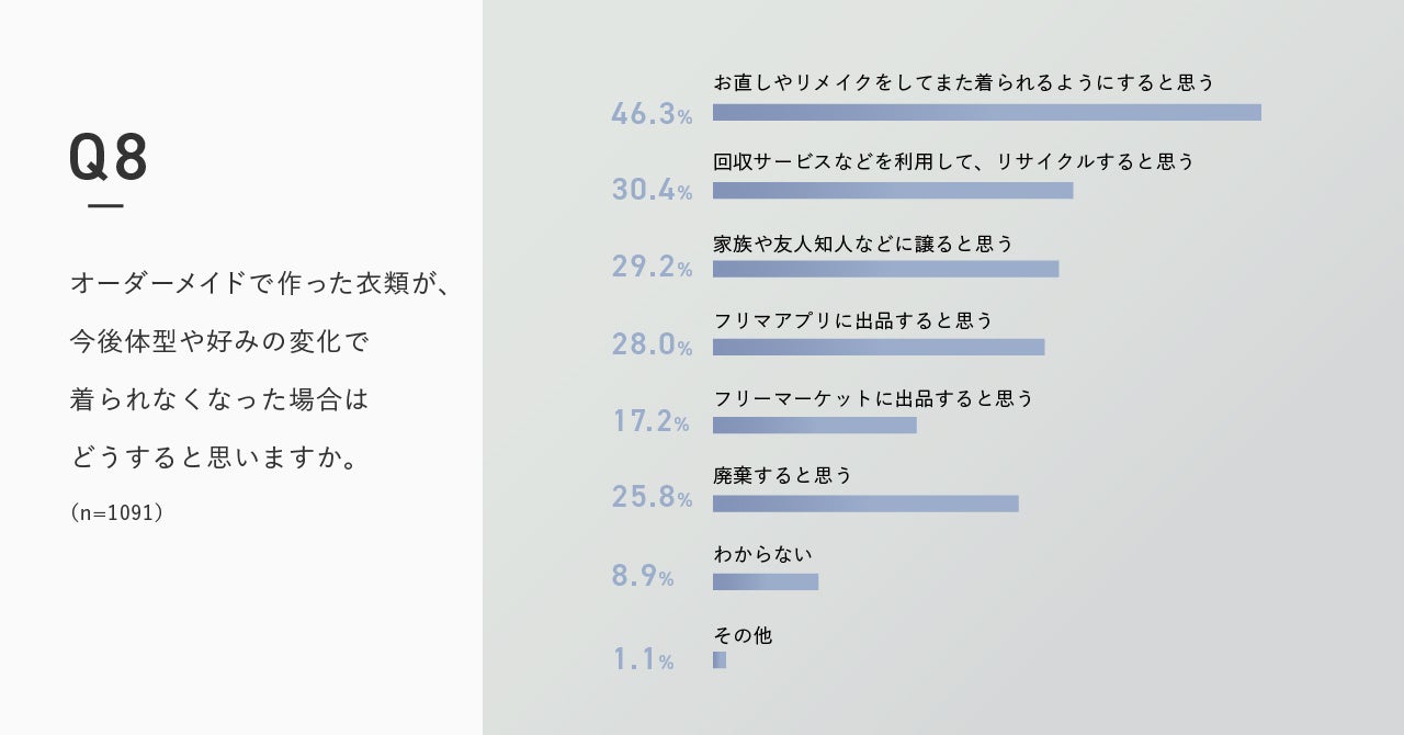さらに、「もしオーダーメイドで作った衣類が、今後体型や好みの変化で着ることができなくなった時はどうすると思うか」との問いに対しては、「お直しやリメイクをしてまた着られるようにすると思う」「回収サービスなどを利用してリサイクルすると思う」と答えた人が「廃棄すると思う」を上回り、オーダーメイドの服はリサイクル・リユースの意向が高いといえることがわかりました。