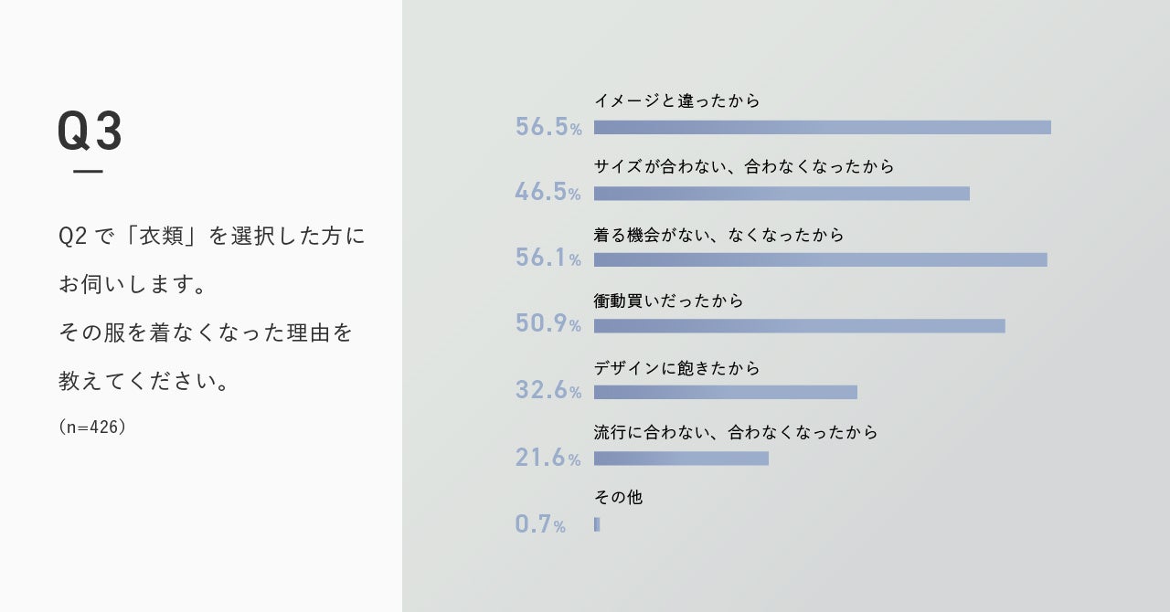 「イメージと違った」、「着る機会がない」、「衝動買いだった」、という理由が見られました。普段より安いからと、必要以上の消費が生まれていることが伺えます。