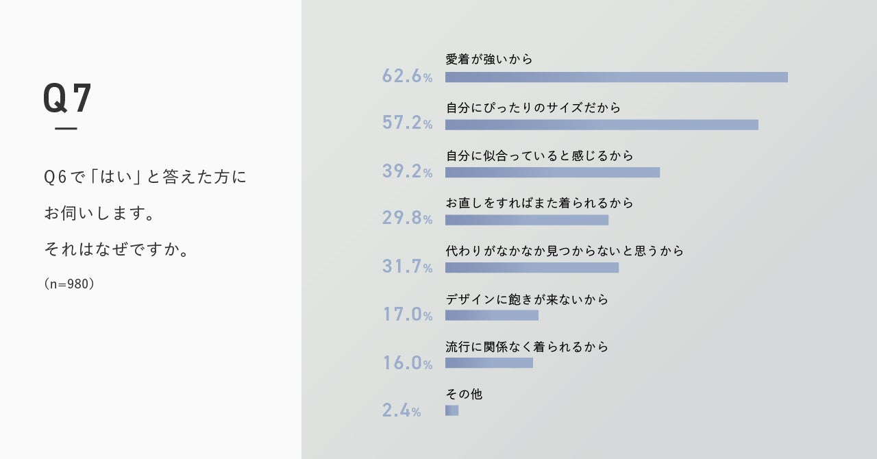 「オーダーメイドで作った衣類は、既製品に比べて捨てづらい」と答えた人は89.8%にのぼり、その理由は1位が「愛着が強いから」2位が「自分にぴったりのサイズだから」という結果に。