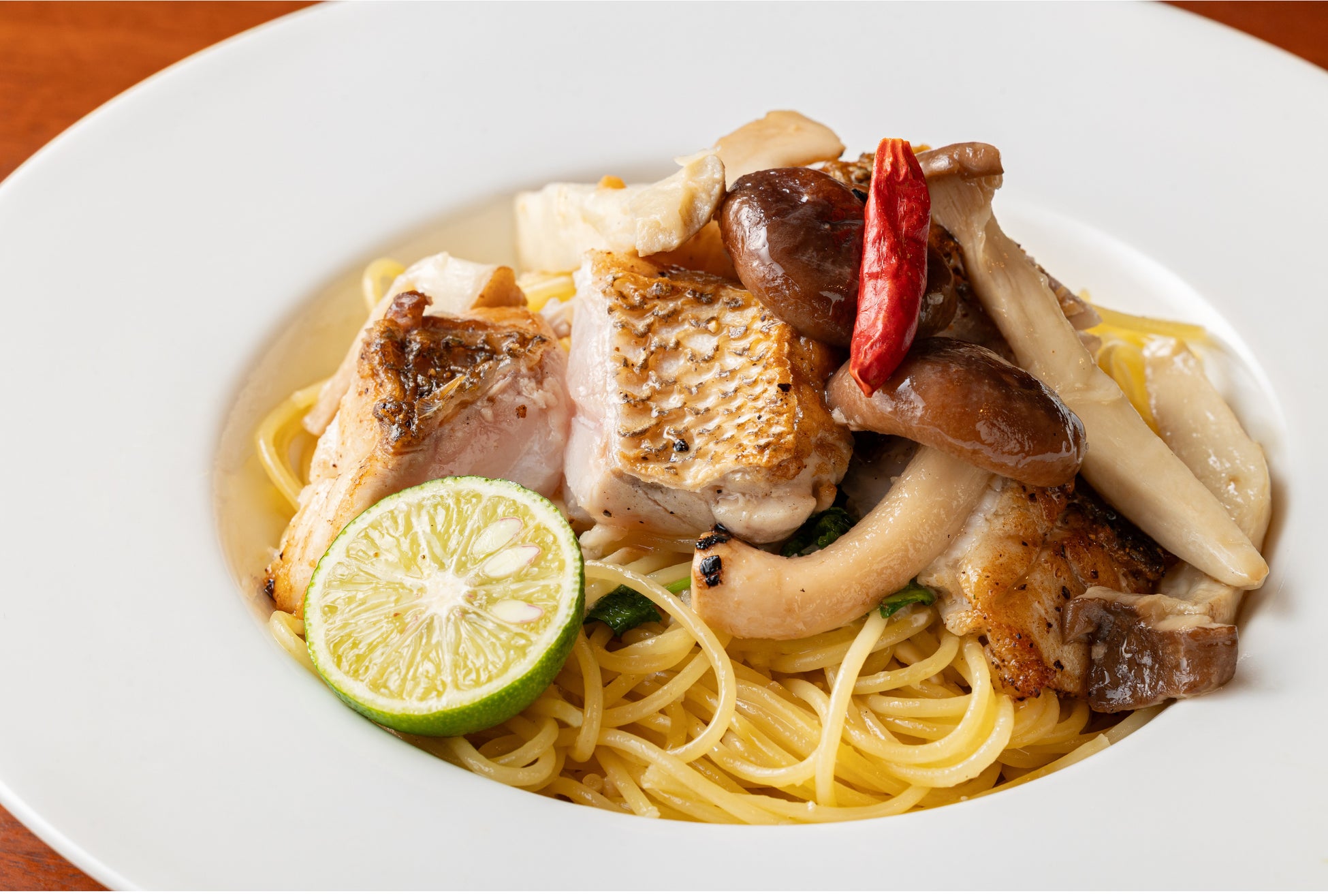 熊本天草の天然真鯛と松茸のペペロンチーノ 酢橘の薫り ※ディナー限定 2,200 円(税込み)