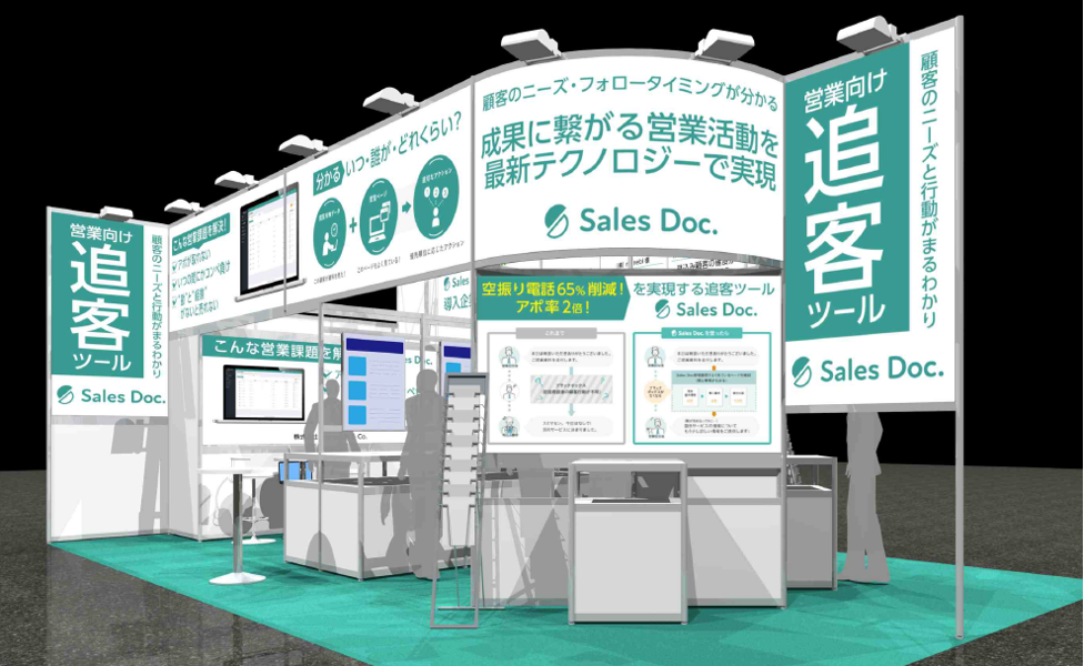 当社ブースでは豊富な導入事例の掲示、製品イメージ動画の放映、製品資料の配布、『Sales doc』のデモスペースでの体験を通して魅力や活用方法をご紹介いたします。