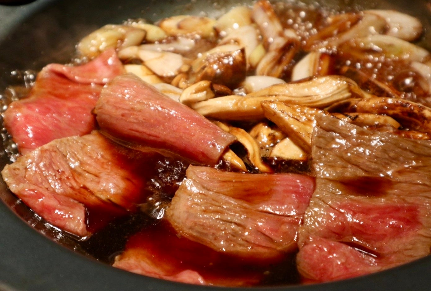 - ご飯片手にすき焼き風に仕上げた松茸×和牛を頬張る