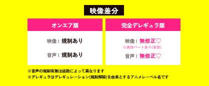 放送で規制されていた部分の規制解除に加えて、全話数において放送できなかったパートが追加された「完全デレギュラ版」の制作が決定いたしました。