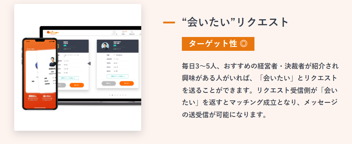 ・5つの機能:検索&DM、タイムライン、“会いたい”リクエスト、経営層限定オンラインイベント、リコメンド&ご紹介