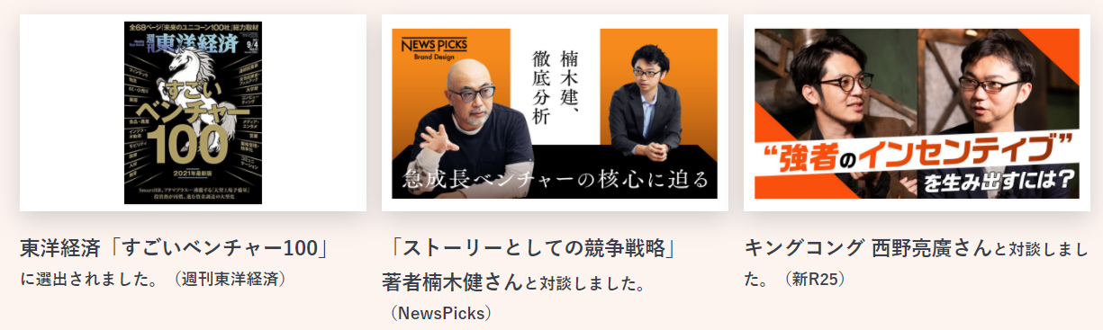 キングコング 西野亮廣さんとの対談(R25)や東洋経済「すごいベンチャー100」選出(週刊東洋経済)など、メディア掲載リンクをバナー形式で表示。