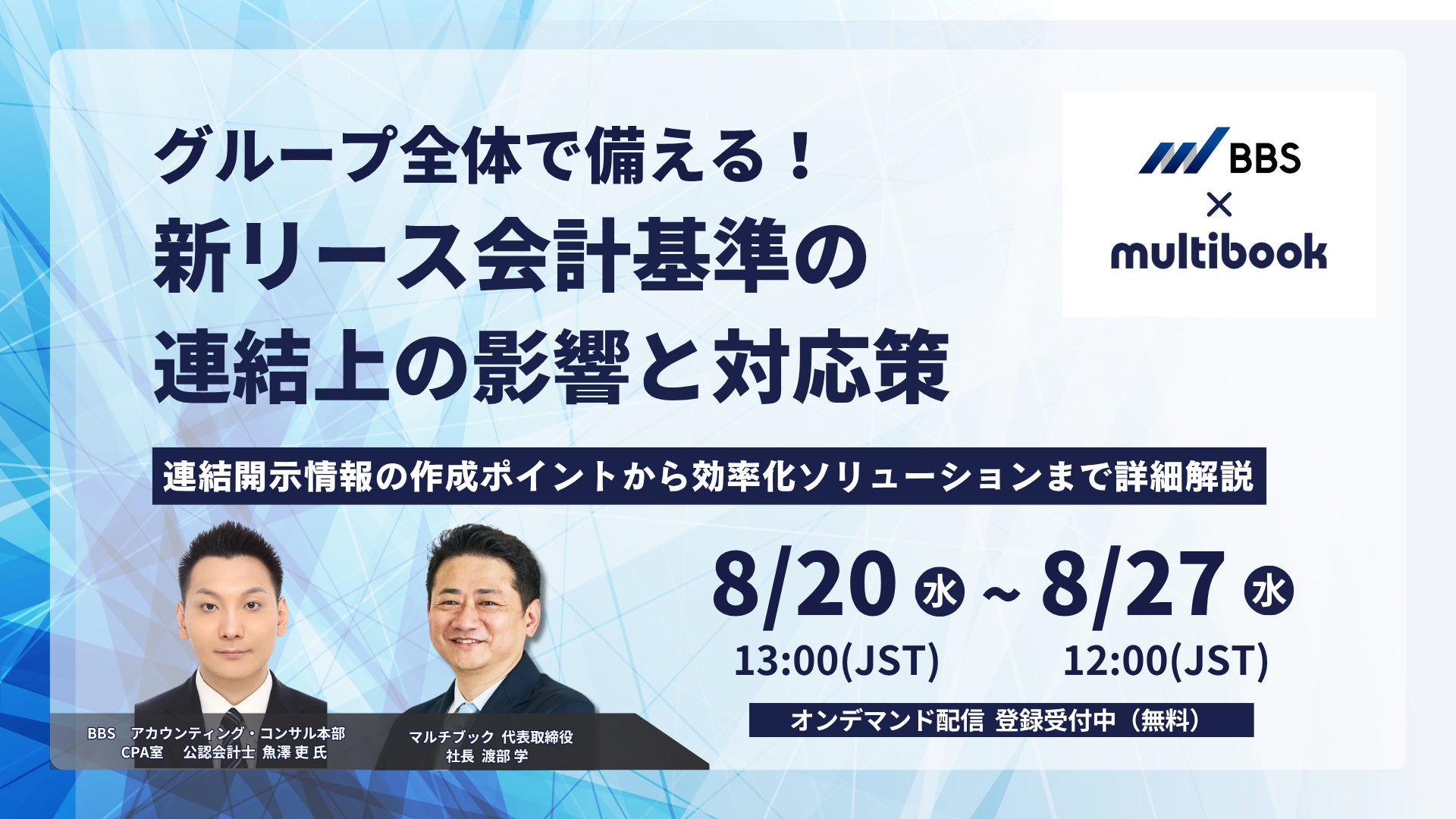 新リース会計基準対応のリース資産管理システムをはじめとするグローバルクラウドERPサービス「multibook(マルチブック)」を提供する株式会社マルチブック(東京都品川区、代表取締役社長:渡部 学)は、今年7/9に開催された、株式会社ビジネスブレイン太田昭和(BBS)共催セミナー「グループ全体で備える!新リース会計基準の連結上の影響と対応策」をオンデマンド配信いたします。