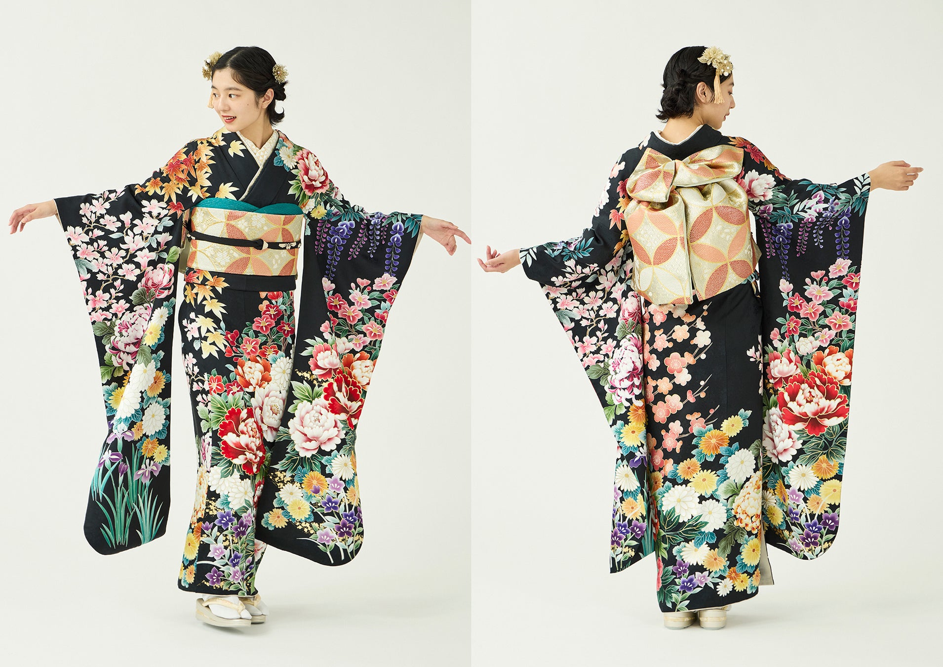 多種多様な四季の花が咲き乱れる花園に佇んでいるような、絢爛豪華な振袖です。黒地に映えるカラフルな配色が、お召しになる方も周りの方も笑顔にする幸福感あふれるデザインが魅力。誰よりも主役になれる、見る人を釘付けにする一枚です。