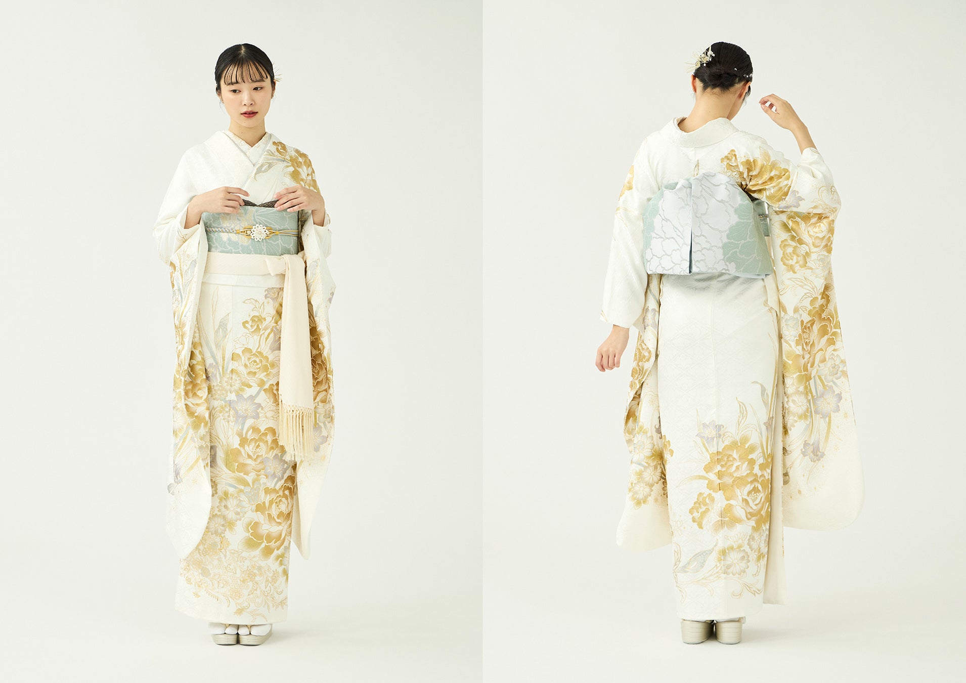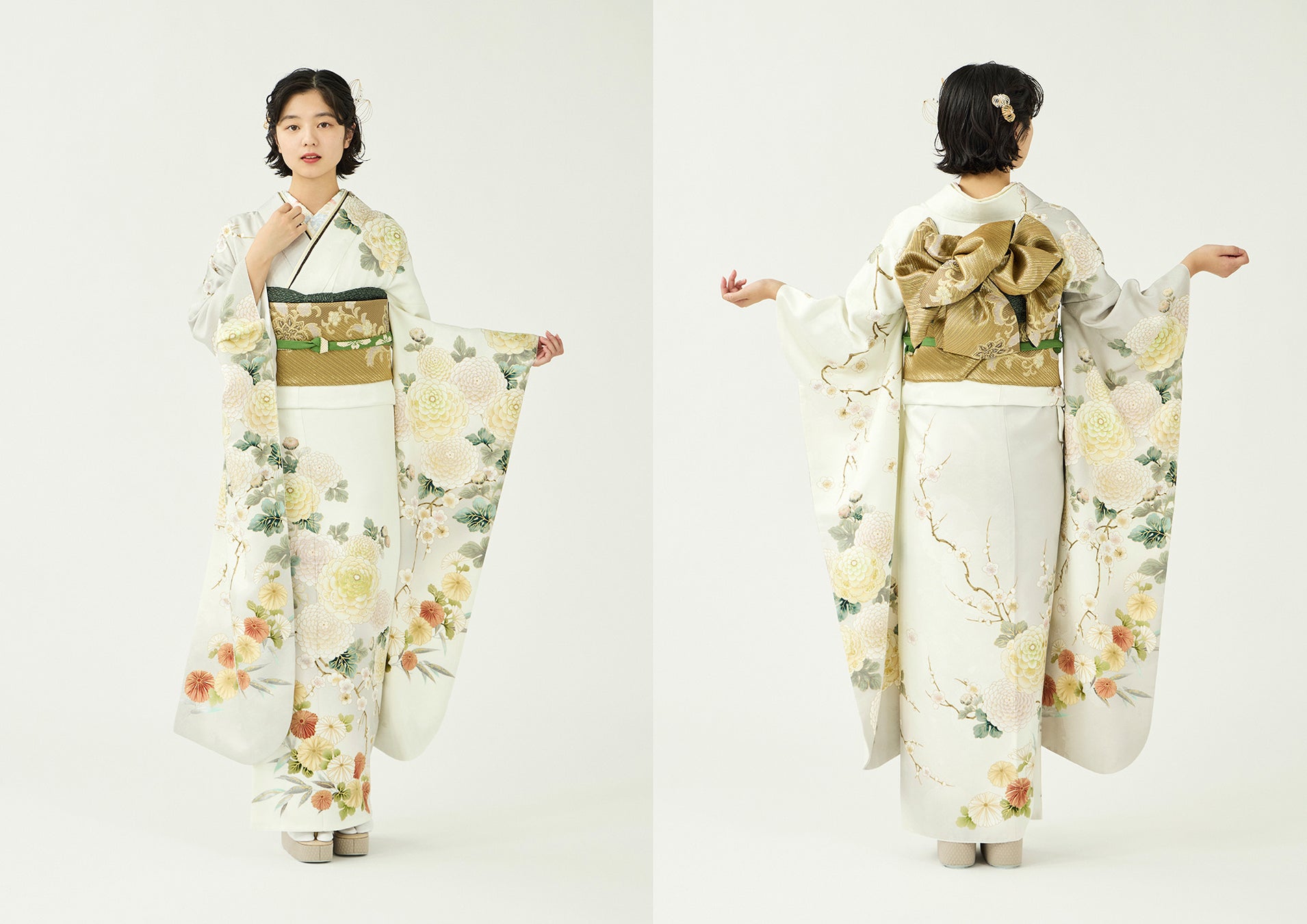 澄んだ冬の朝を思わせるようなきりりとした白と淡いグレーの地色に、優しい色合いの花が可憐な印象の振袖です。モチーフの菊の花には「無病息災」「心身の充実」、梅の花には「長寿」「気品」という意味があります。お召しになる方がいつまでも心身ともに健やかで、願いを叶えられますようにという願いを込めています。
