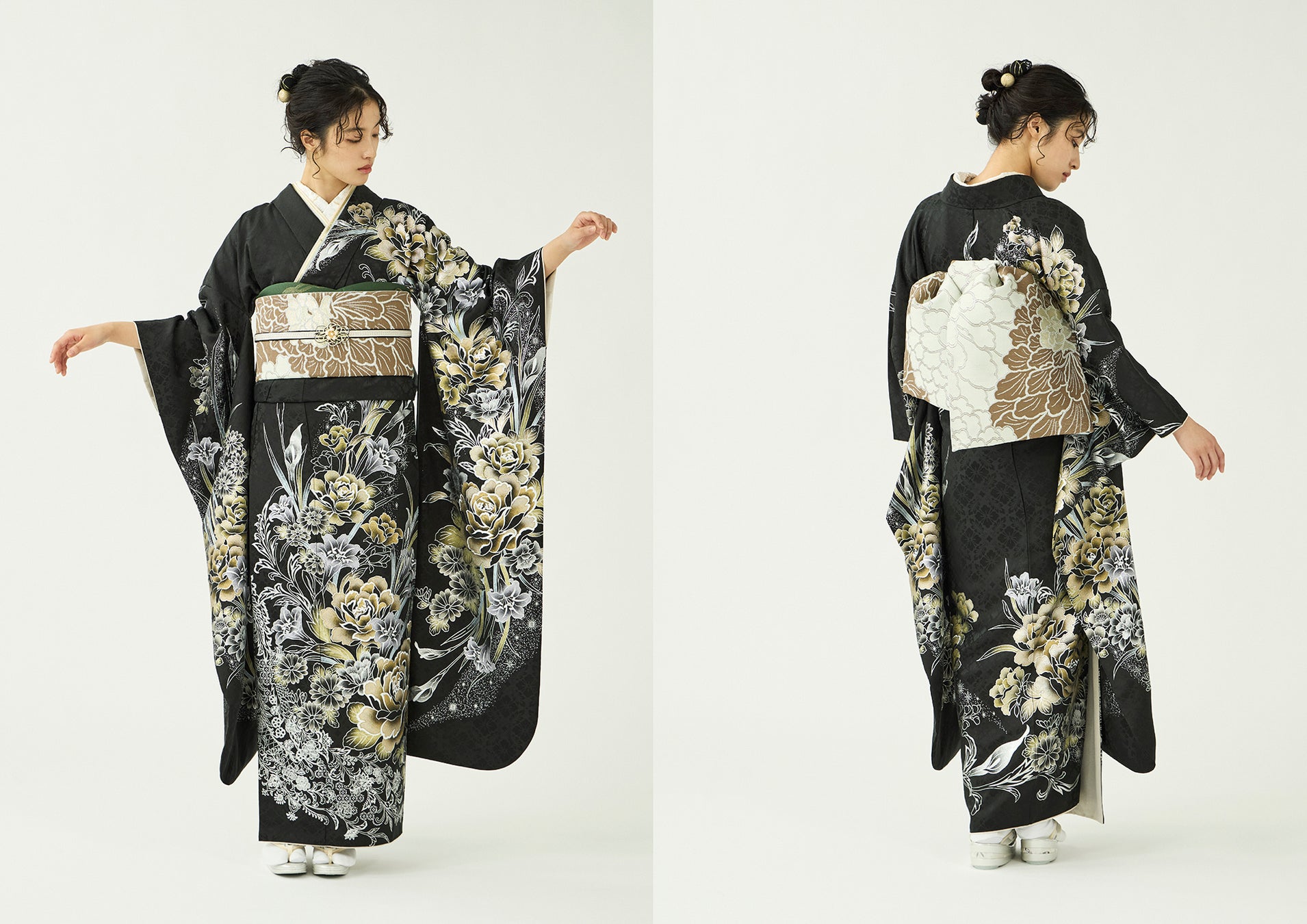黒い羽のような光沢のある黒地に金銀の花々が咲き誇る振袖です。大輪の花を引き立てるように描かれた銀の更紗模様が着姿を軽やかに見せます。大胆なデザインでありながら、伸びやかな構図とすっきりとした色使い、繊細な金彩表現により、しっかりとした意志のある印象を与える一枚です。