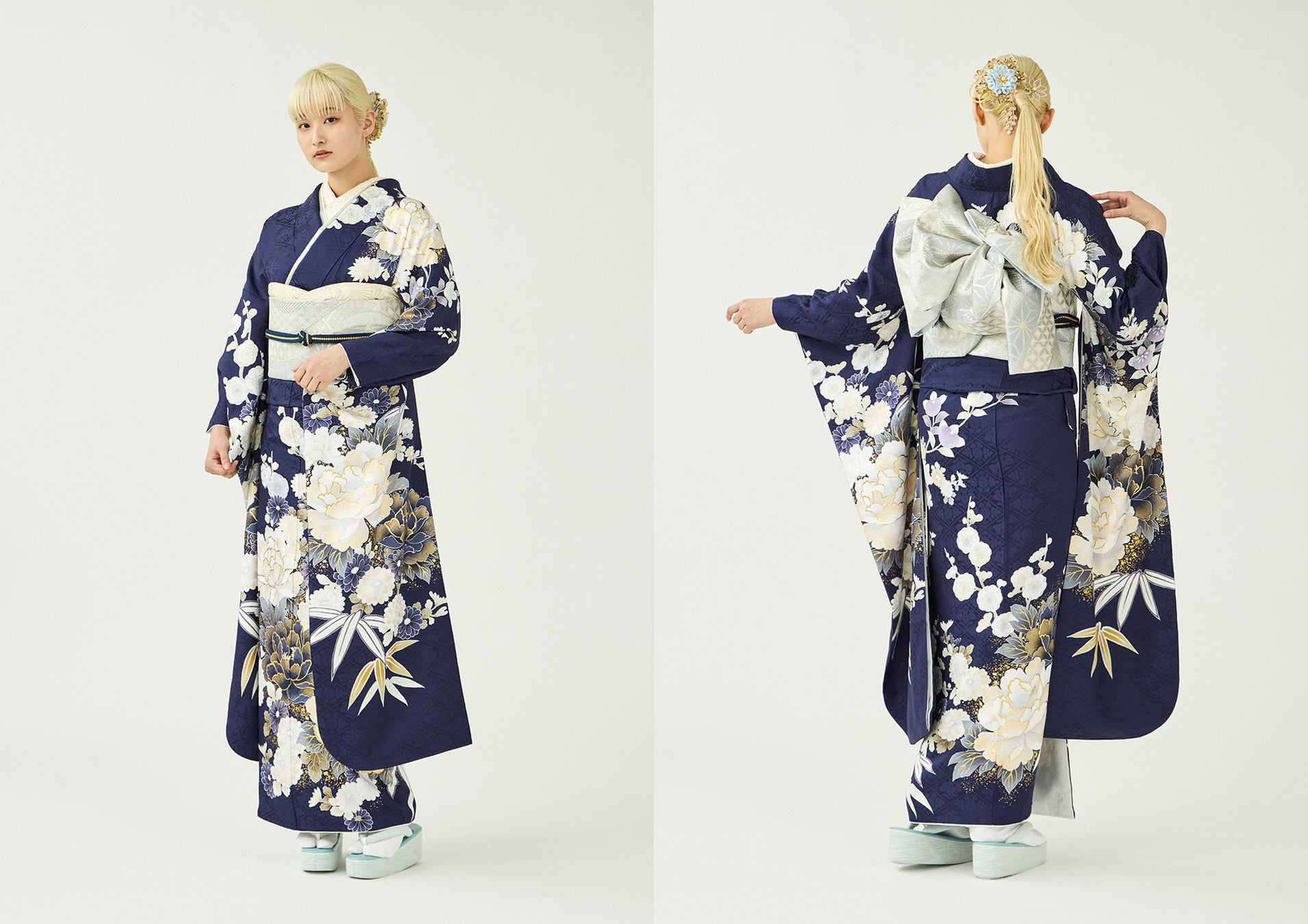 濃い紺色の地に、白を基調とした配色で牡丹や菊などの花をデザインした振袖です。あえて寒色系でまとめることで、昼に見る夢のような、空想の世界のような、そんな不思議な清々しさがあります。帯や小物は、すっきりと同系色で合わせたり、アクセントで色を挿したりと、コーディネートで印象が変わる一枚です。
