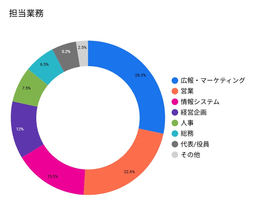 担当部門別では、「広報・マーケティング部門」からの依頼が全体の28.3%と最多。続いて「営業部門(22.6%)」「情報システム(15.5%)」「経営企画(12.0%)」「人事(7.5%)」と続きました。