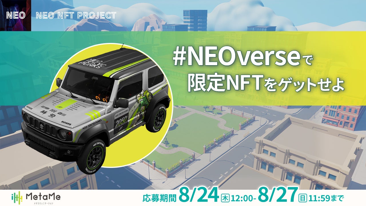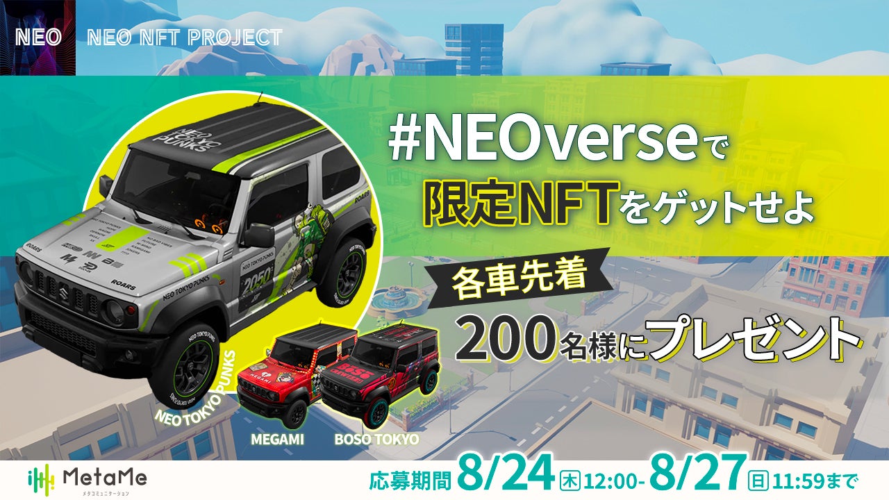 内容:MetaMe内のどこかに設置されたコラボカーNFTを見つけ、MetaMeでマイアバターと一緒に写真を撮影。Twitter(X)でNEOとMetaMeの公式アカウントをフォローの上、「#NEOverse」のハッシュタグをつけてキャンペーン告知を引用リツイートすると、各デザイン先着200名がコラボカーNFTを獲得できます。