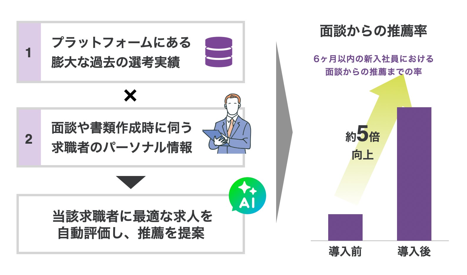 実際に当社内で一部の新入社員に向けて導入した結果、求職者との初回面談から、求人企業への推薦率は導入前と導入後を比較して約5倍向上する成果を確認できております。この成果を背景に、現場への最適化を行い、さらなる機能拡張を実施、外部提供も目指して、本システムの本格的な開発を開始することを決定いたしました。