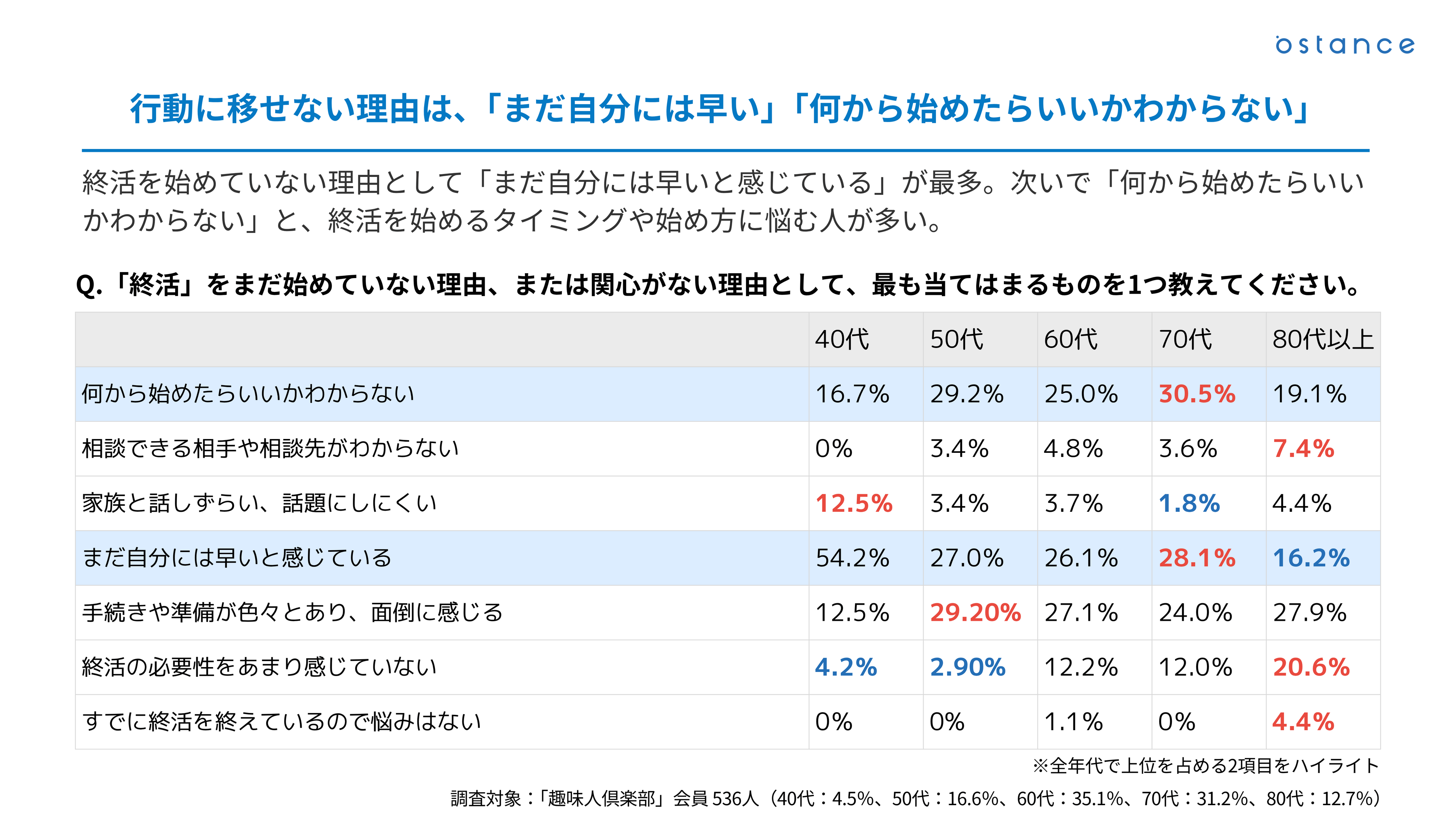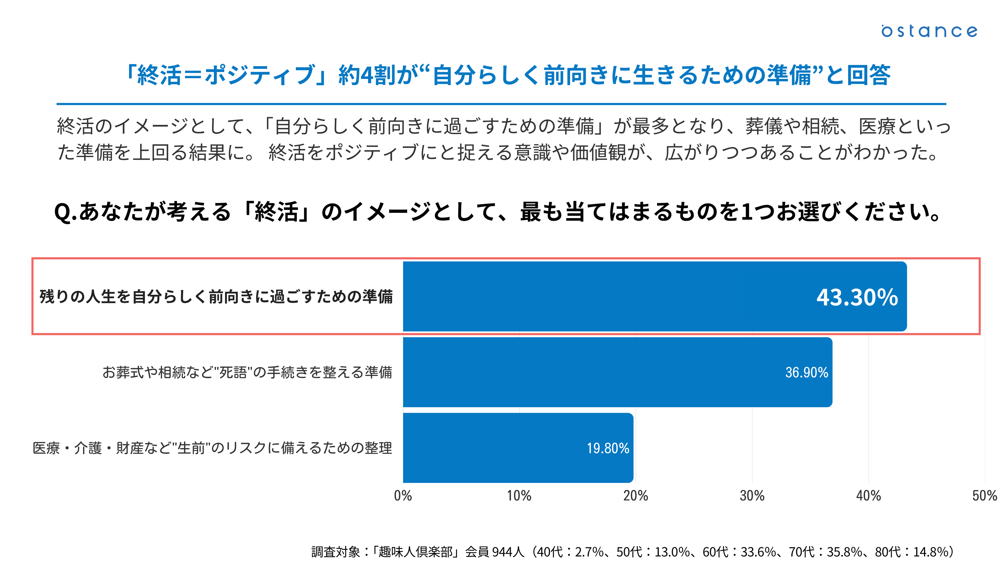 シニア世代向けSNS「趣味人倶楽部」を運営する株式会社オースタンス(本社:東京都品川区、代表取締役社長:菊川 諒人)は、50〜70代のシニア世代1,973名を対象に「終活」に関する意識・行動調査を実施しました。今回はその結果と、趣味人倶楽部が展開する終活関連イベントの取り組みをあわせてご報告します。