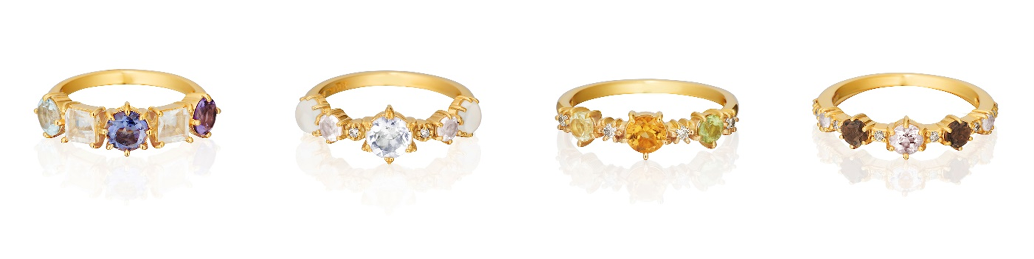 カラフルなストーンを色鮮やかに配置した、EAU DOUCE4℃らしいクラシカルなリングも登場。カラーストーンの上品な色合いに心惹かれる4型のリングが手元を鮮やかに彩ります。こだわりのカッティングを施したストーンの多彩な煌めきで夏の装いをひときわ華やかに。