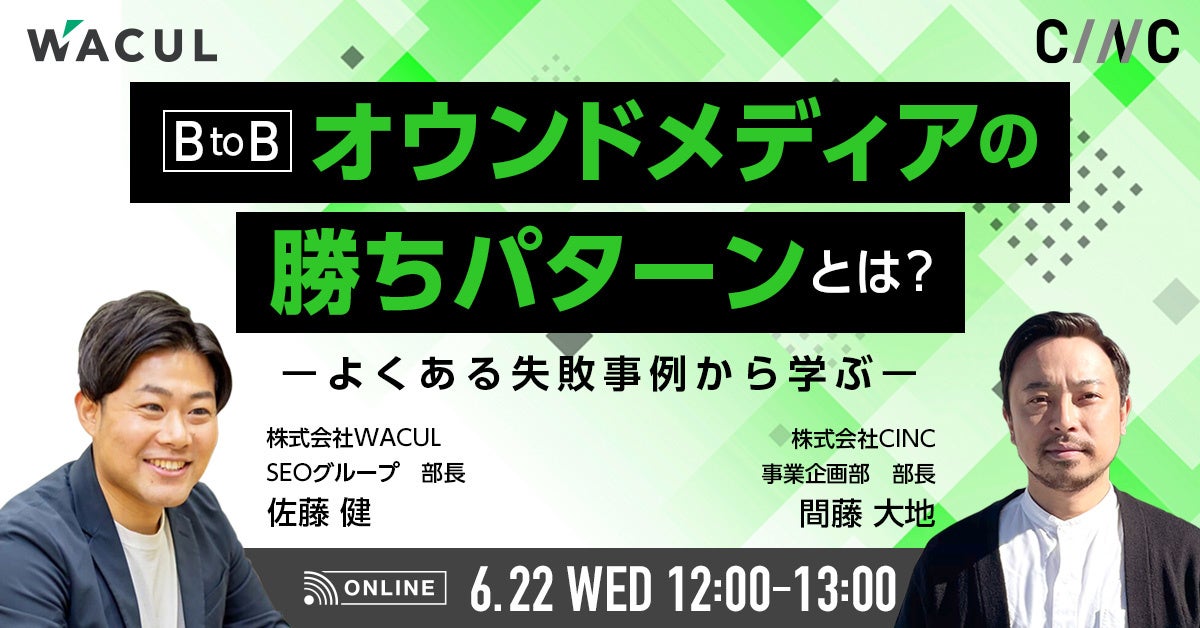 株式会社WACULとオンラインセミナー『BtoBオウンドメディアの勝ちパターンとは?~よくある失敗事例から学ぶ~』を開催いたします。