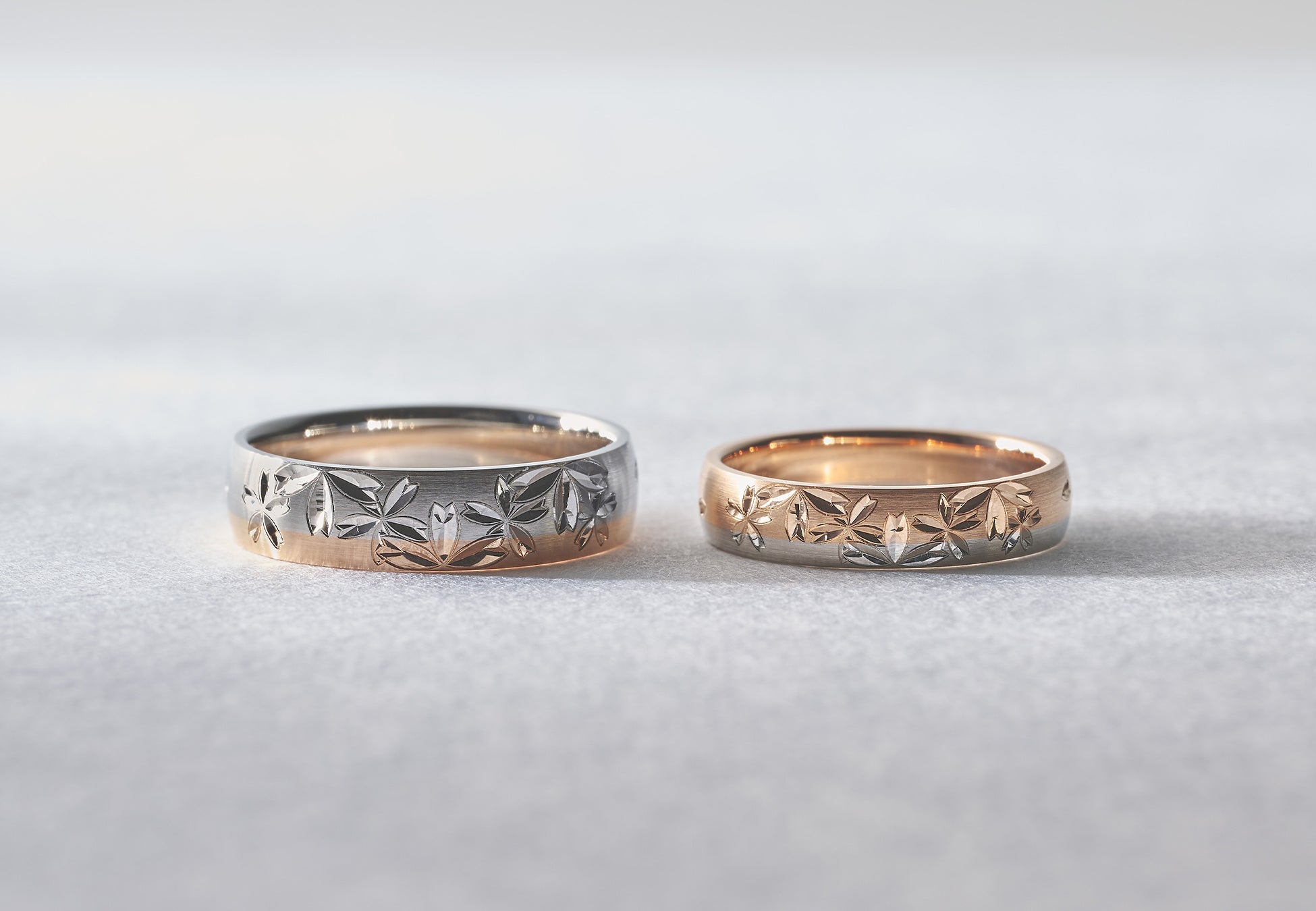 豊かで満ち足りた人生を歩めるよう、幾重にも重なる桜の花に想いを託して、彫金師 外山 幸二氏によって繊細で力強い彫りが指輪に施されています。