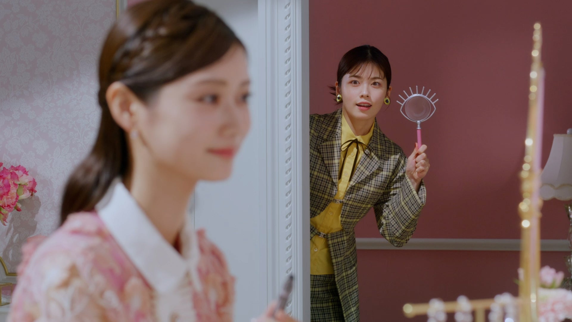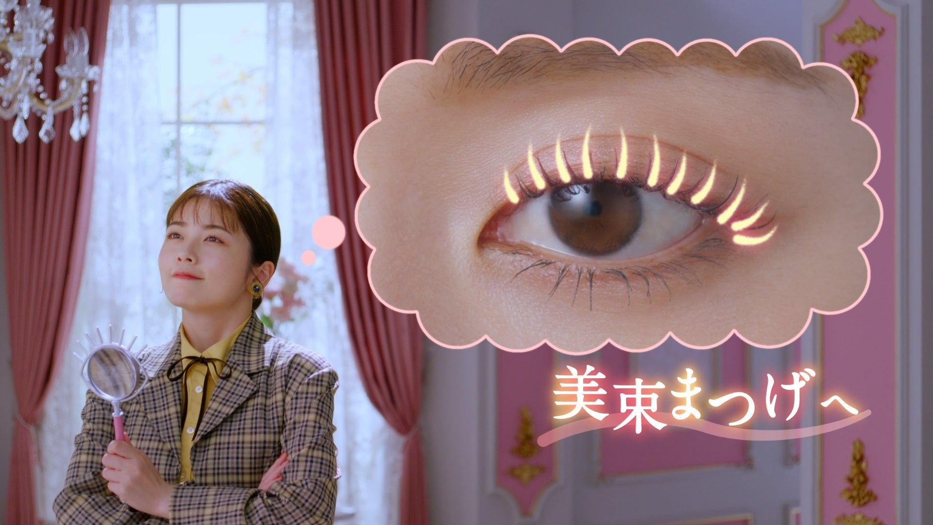 謎解きドラマの主人公“美まつげ探偵”として、颯爽と現れる小芝さん!事件の香りを嗅ぎつけ、瞳の形をしたユニークな虫メガネを片手に捜査を開始します。あの子の美しい束感まつげの秘密とは…?何かを察して「はっ!」と目を見開く小芝さん。その視線の先にあったのは、極細メタルコームの「メタルックマスカラ」!0.45mmの均一なピッチ&直径2.5mmの極細メタルコームで、まつげを逃さずしっかりキャッチ。だから、美束まつげを叶えているのだとつきとめます。「…というわけですね?」と、意気揚々と女性に語り掛ける小芝さん。たじろぎながらも女性が「はい」と答えると、小芝さんは「よしっ!」と虫メガネを持った手で小さくガッツポーズ!無事謎を解明した美まつげ探偵小芝さんは、自身も美束まつげできゅるんと目力UP※して、めでたしめでたしなのでした…♡