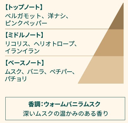 深いムスクの温かみのある香りがまとう人の魅力を強め、自信を宿し、自分を表現する力を与えてくれるような気持ちになるオードパルファム。ムスクをベースに、ベルガモットやピンクペッパーのアクセントと、イランイランやバニラの甘さがやわらかに香ります。深みのある魅惑的な香りが、まとう人の想像力を掻き立て魅了します。