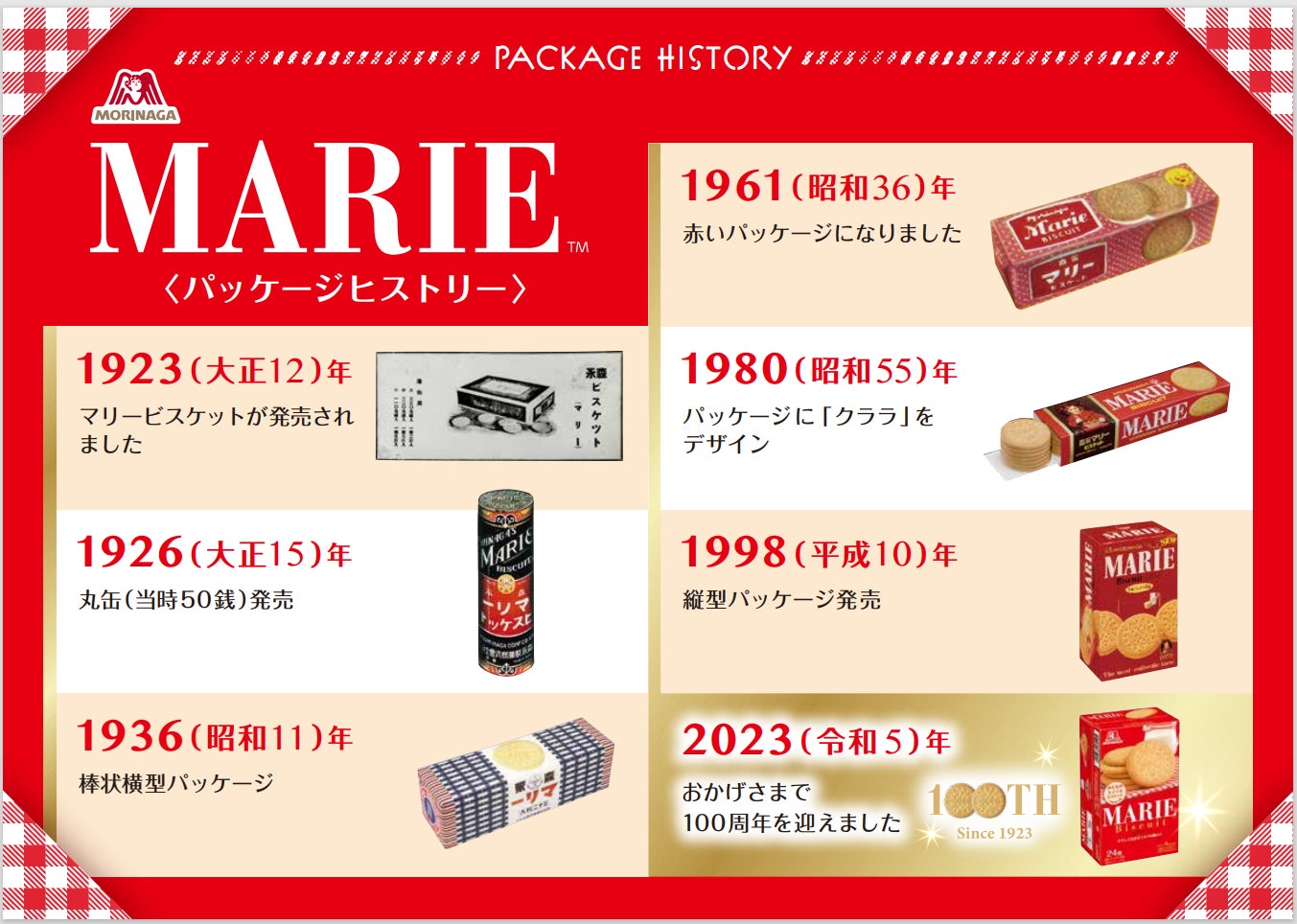 1923年発売。森永製菓が国内向けとして、初めて発売した16種類のビスケットの一つとしてマリーは誕生しました。