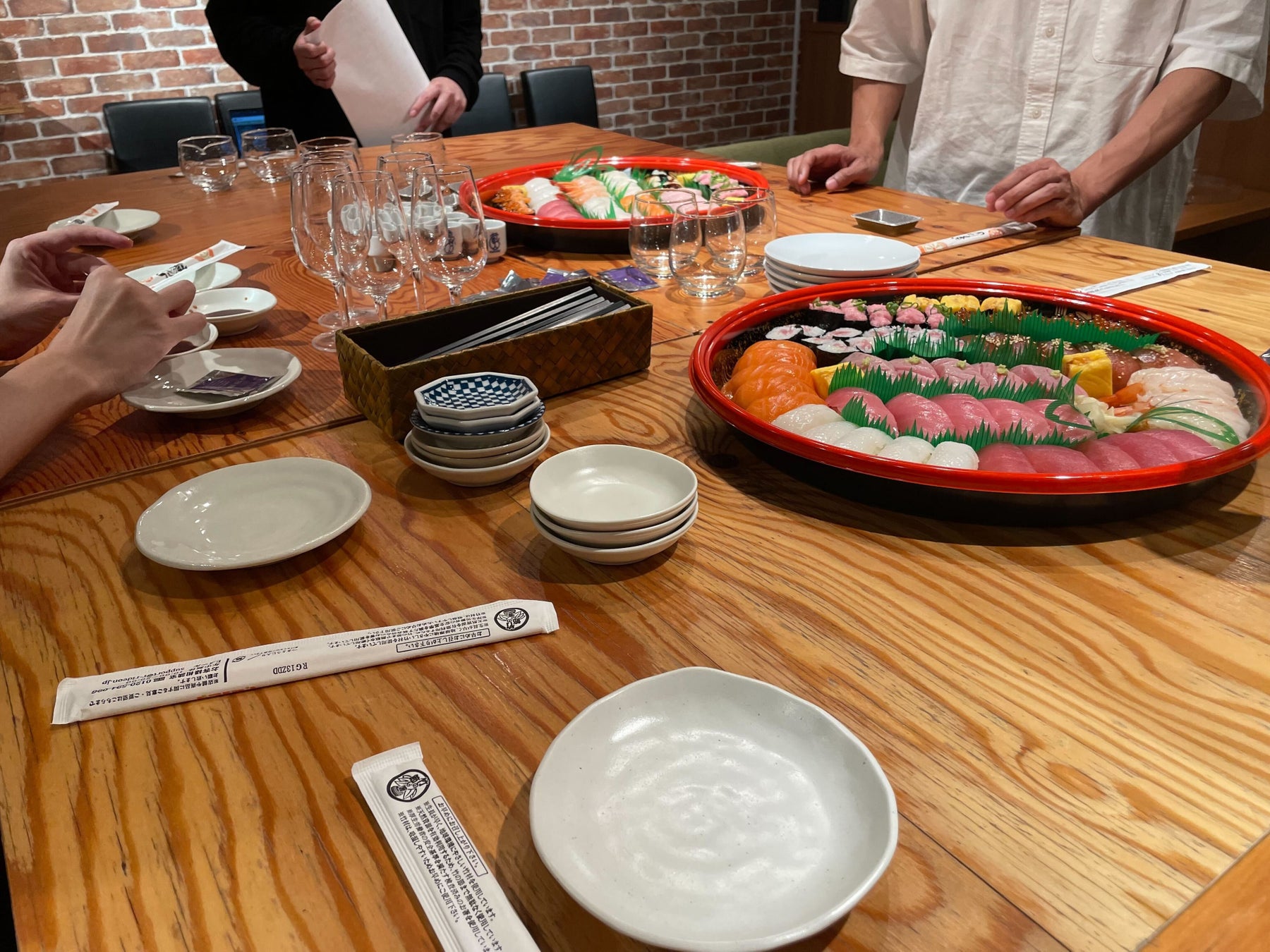 「銀のさら」からはかつて商品開発やネタの仕入れも経験したメンバーなど、「クランド」からは酒蔵で社氏を経験したメンバーなどそれぞれ5名ずつ、計10名が参加し、実際に「銀のさら」の寿司を食べながら、順番に試飲していきました。