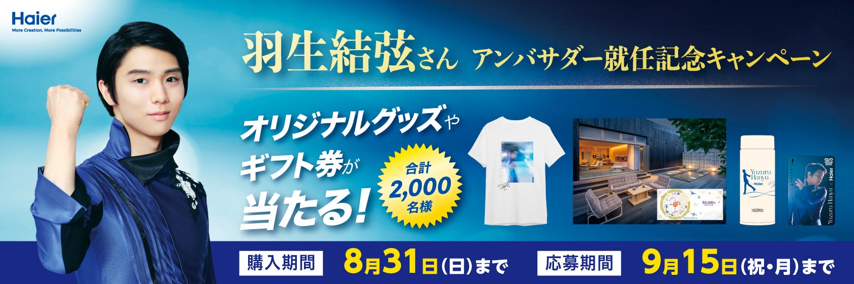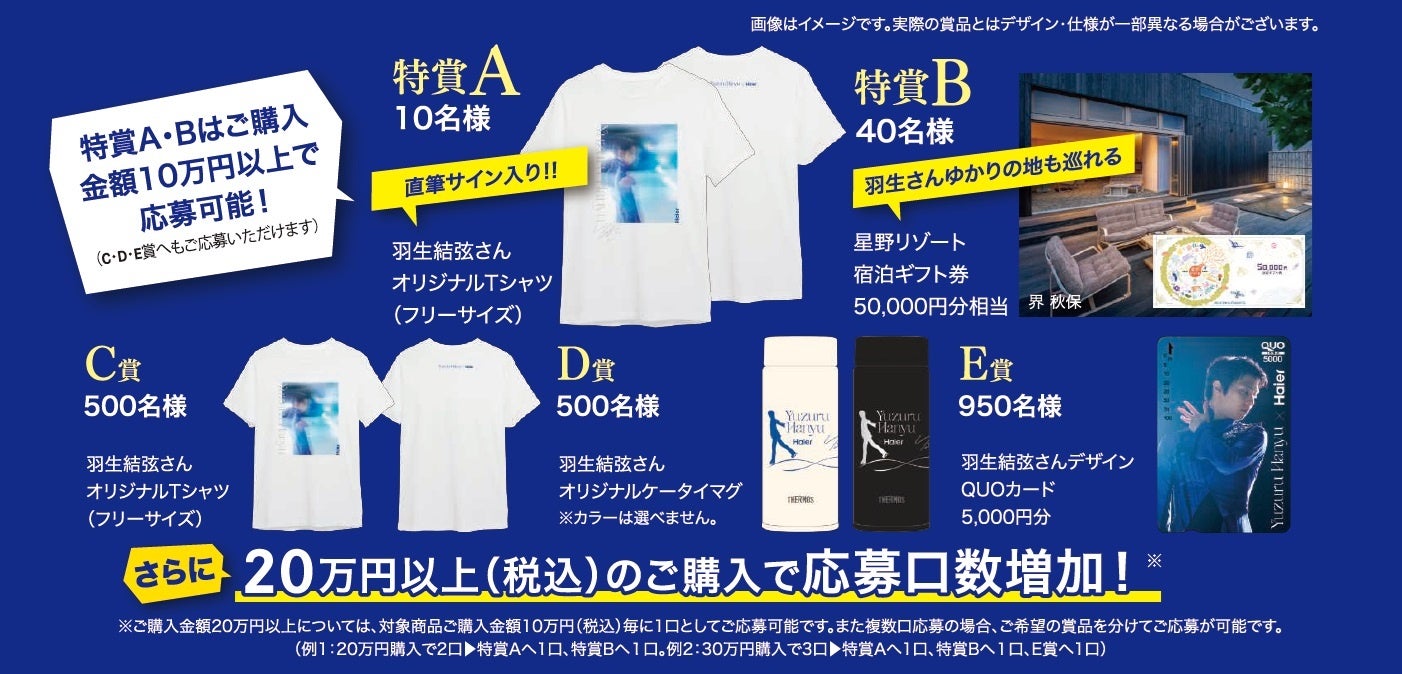 当社はこの度、羽生結弦さんのアンバサダー就任を記念して、ハイアール製品をご購入いただいた方を対象としたプレゼントキャンペーンを実施いたします。本キャンペーンでは、期間中に対象商品を購入の上、ご応募いただいた方の中から抽選で合計2,000名様に、羽生結弦さんオリジナルグッズや豪華ギフト券をプレゼントいたします。