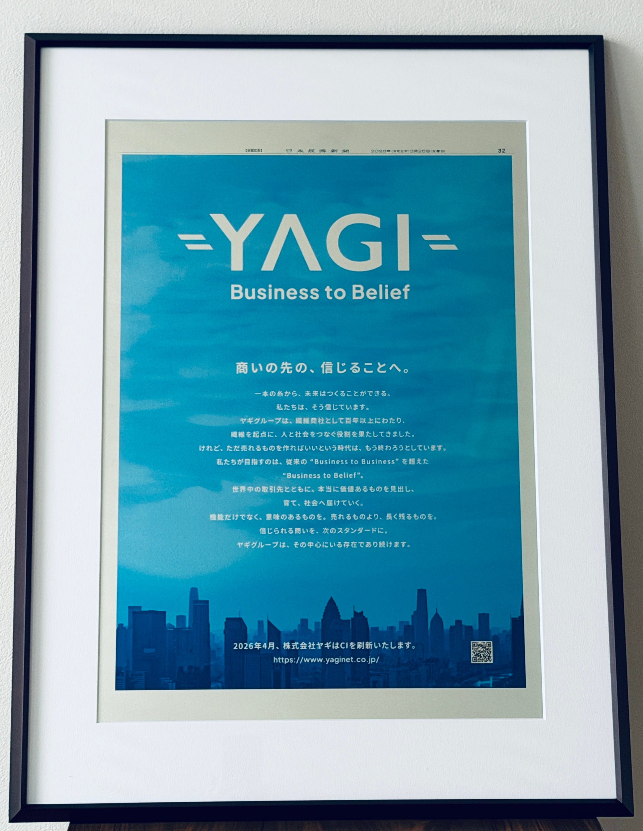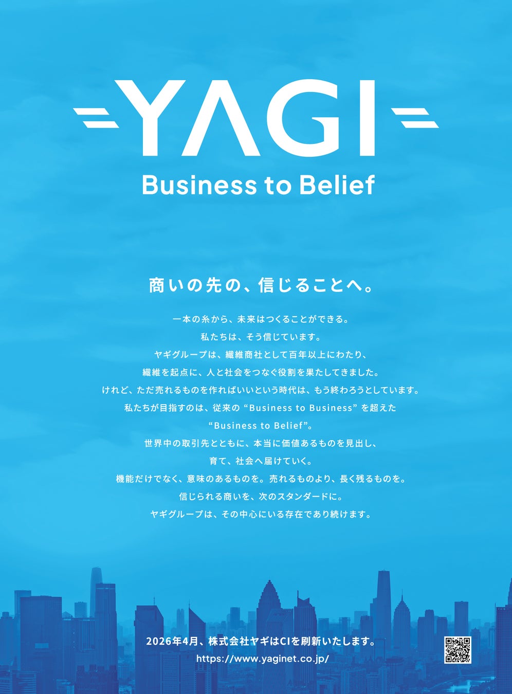 株式会社ヤギ(本社:大阪市中央区・東京都港区、代表取締役 社長執行役員:八木隆夫、以下「当社」) は、未来に向けた「新たな旗印」として新コーポレートロゴマークおよびタグラインを策定し、2026年4月1日からの展開開始に伴い、3月25日付の日本経済新聞(全国版・朝刊)に 企業広告を掲載いたしました 。