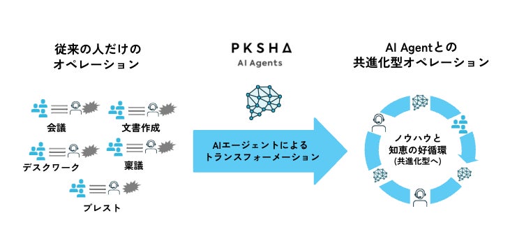 これまで、人の言葉を理解して業務改善を支援する多様なAIソリューションやプロダクトを開発・提供してきましたが、昨年度よりそれらをより能動的に動くAIエージェントとして機能強化を進めてきております。従来の「ボット」と呼ばれるチャットボットやボイスボットなどのプロダクトにAI エージェントとしての機能を順次追加したり、人事や営業領域などにAIエージェントを導入するなど、PKSHAグループ全体で取り組みを広げます。追加詳細については、カンパニー制(※1)が執行される2025年7月にかけて、随時発表を予定しています。