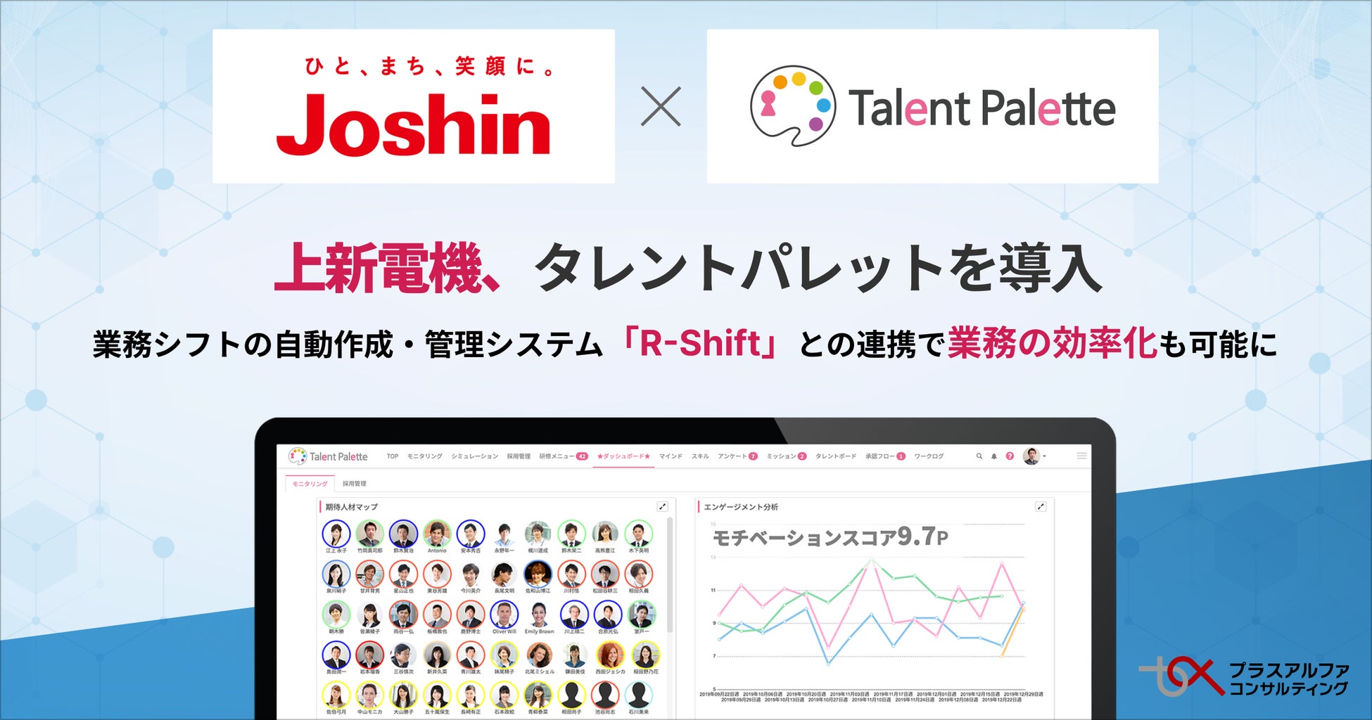 株式会社プラスアルファ・コンサルティング(本社:東京都港区、代表取締役社長:三室克哉 証券コード:4071)は、科学的な人材活用や人的資本経営の推進、人事業務のDX化などを背景に、多くの大手企業で導入が進んでいるタレントマネジメントシステム「Talent Palette(以下:タレントパレット)」を、上新電機株式会社(本社:大阪府、代表取締役社長:金谷隆平、以下「上新電機」)に導入いただきましたことをお知らせいたします。