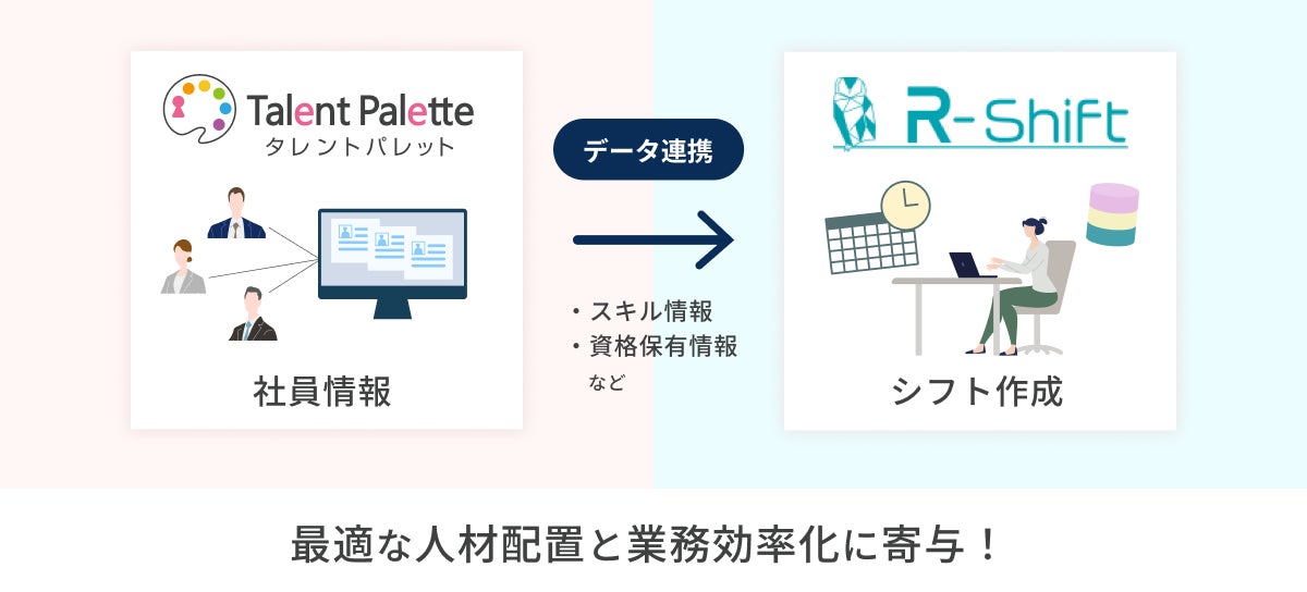 「タレントパレット」と業務シフトの自動作成・管理システム「R-Shift」の連携により、タレントパレット内の社員情報を活用したシフト作成が可能となり、最適な人材配置と業務効率化を目指します。