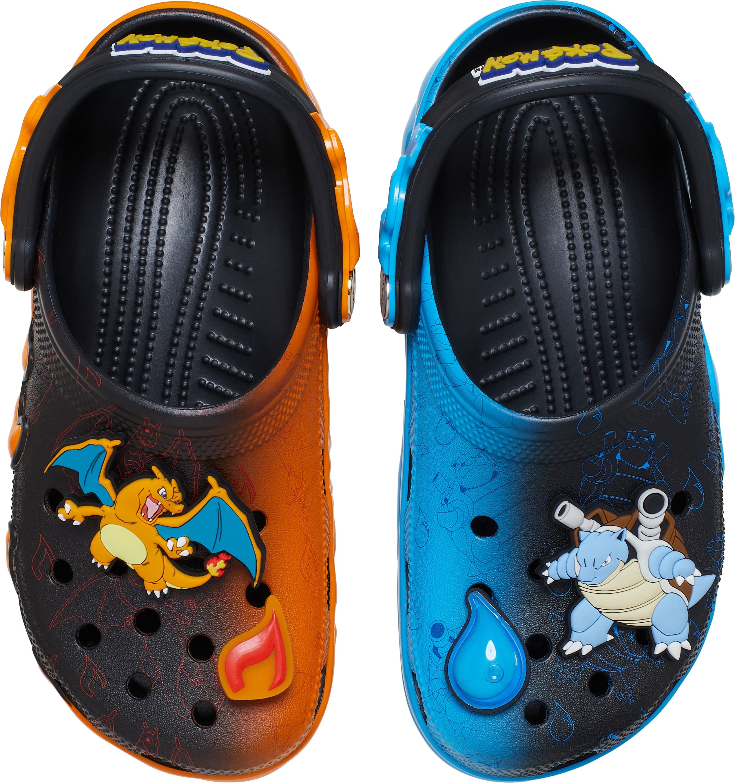 左右非対称のデザインが目を引く「ポケモン バーサス クロッグ」は、異なるタイプのわざを表現するモチーフが足元でぶつかる、バトルのワクワクをそのまま形にしたような仕上がりに。右足はオレンジ色をベースにリザードンのプリントやジビッツ™ チャームを、左足は青色をベースにカメックスのプリントやジビッツ™ チャームがデザインされています。ほのおとみず、対照的なポケモンの姿がカッコいい、インパクトのあるデザインとなっています。