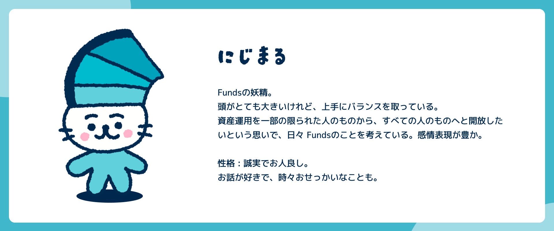 当社ではサービス開始以来「未来の不安に、まだない答えを。」というミッションを掲げて資産運用の民主化を目指し、シンプルな商品設計や透明性の高い審査プロセスの開示などを心がけてまいりましたが、もう一歩踏み出して、資産運用およびFundsのサービスに対する「こわい」等のイメージを少しでも払拭し、新しい資産運用の方法として知っていただきたいという思いから、このたびオリジナルキャラクターを開発いたしました。