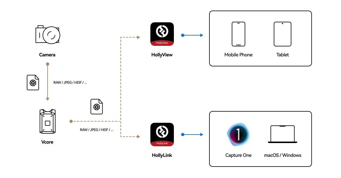 これらのファイルは、HollyViewアプリを通じてモバイルデバイスに、Capture Oneプラグインを通じてMacOSにワイヤレスでリアルタイムに送信されます。