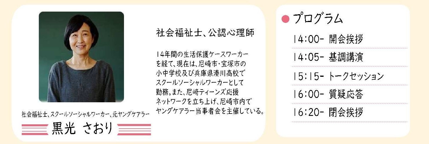 社会福祉士、スクールソーシャルワーカー、公認心理師であり、ご自身も元ヤングケアラーである黒光さおりさんを講師にお招きし、「ヤングケアラーを知り、気づき、関わる」ための研修会を開催します。