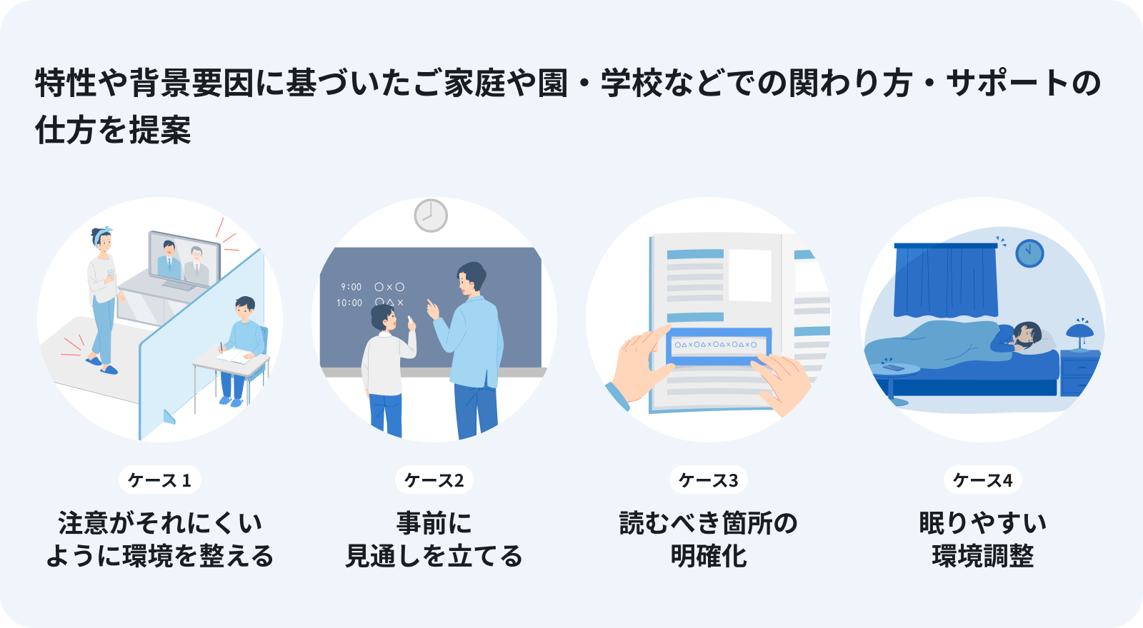本検査では、ご家庭や園・学校などでの具体的な関わり方・サポートの仕方を提案します。