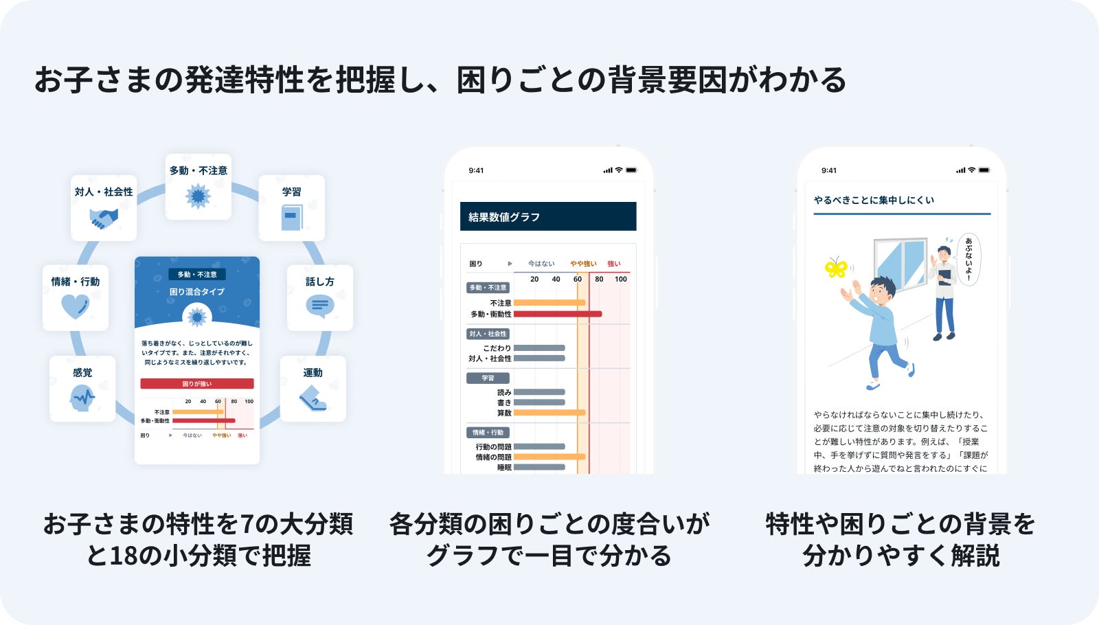 保護者さまが、お子さま一人ひとりに合ったサポート方法を検討いただく際にご活用いただけるよう、専門家監修のもと、簡便に受検でき、具体的なサポート方法の案をすぐに確認できるオンライン検査サービスを開発いたしました。