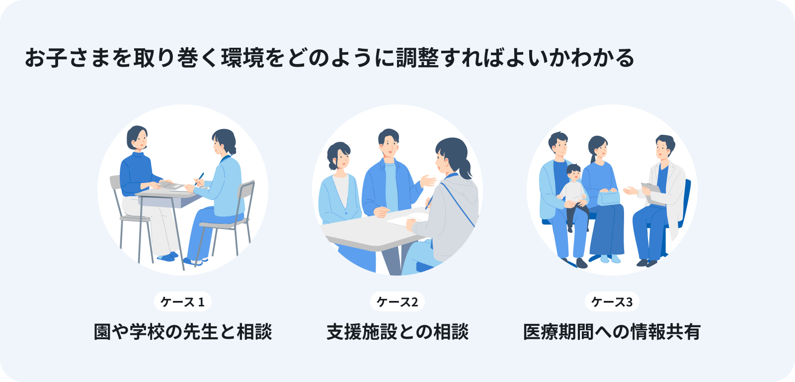子どもの発達の特性は一人ひとり異なり、環境との相互作用により生じる困りごとにも様々な種類があります。