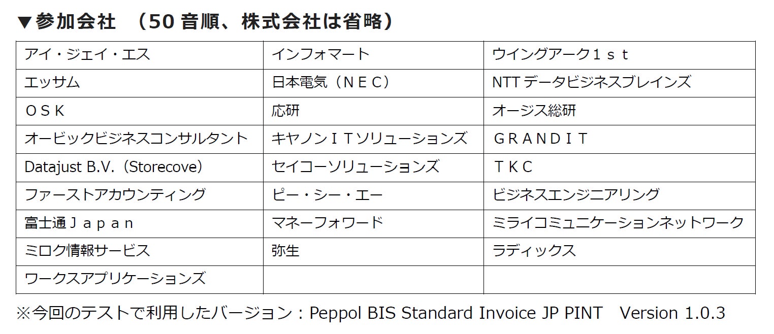 本テストは、下記のEIPA会員有志25社が参加し、各社が提供するデジタルインボイス(Peppol e-invoice)対応製品サービスとの間で実施いたしました。これにより、それぞれのお客様の環境において、異なるシステム間での送受信ができることが実証されました。
