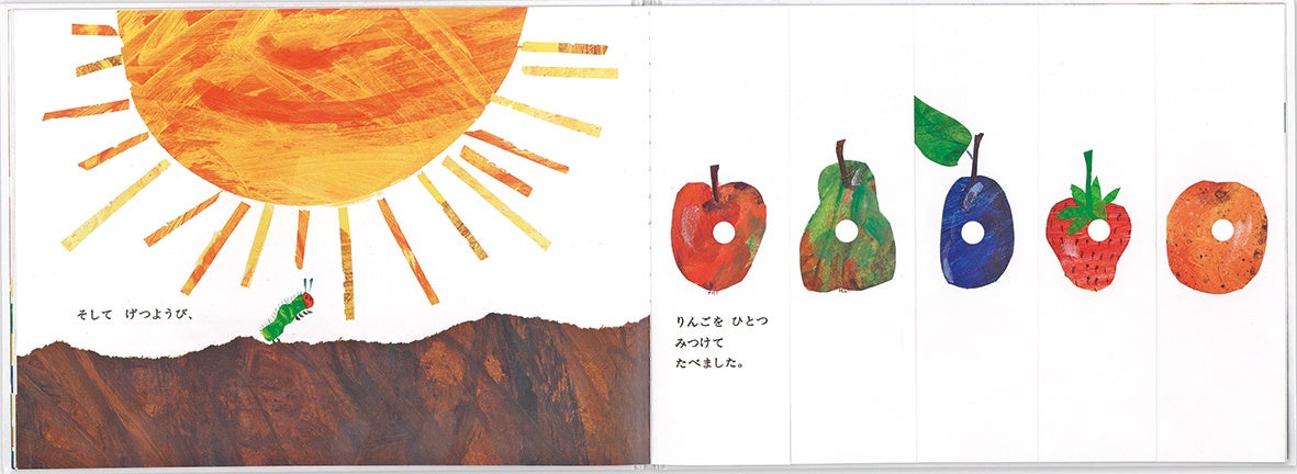 卵から生まれた小さなあおむしが、月曜日にりんごをひとつ、火曜日になしをふたつ、水曜日にはすももをみっつ……とおいしい食べものをどんどん食べて大きくなり、最後は美しいちょうになるという、希望に満ちたストーリーです。