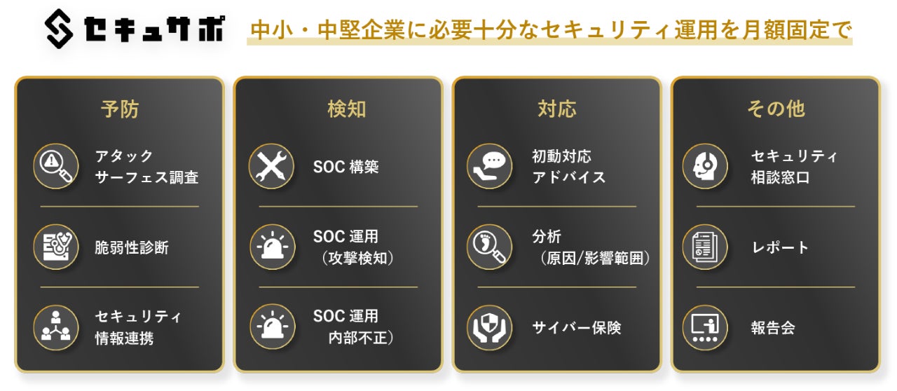 「セキュサポ」は、中堅・中小企業のセキュリティ強化をトータル支援するクラウドセキュリティサービスです。サイバー攻撃・内部不正の監視や脆弱性診断、事件時の原因特定や影響範囲の調査、日ごろのセキュリティ相談の窓口など、サイバーセキュリティの専門チームが、貴社のセキュリティ対策に求められる包括的な対応を月額固定料金で提供します。