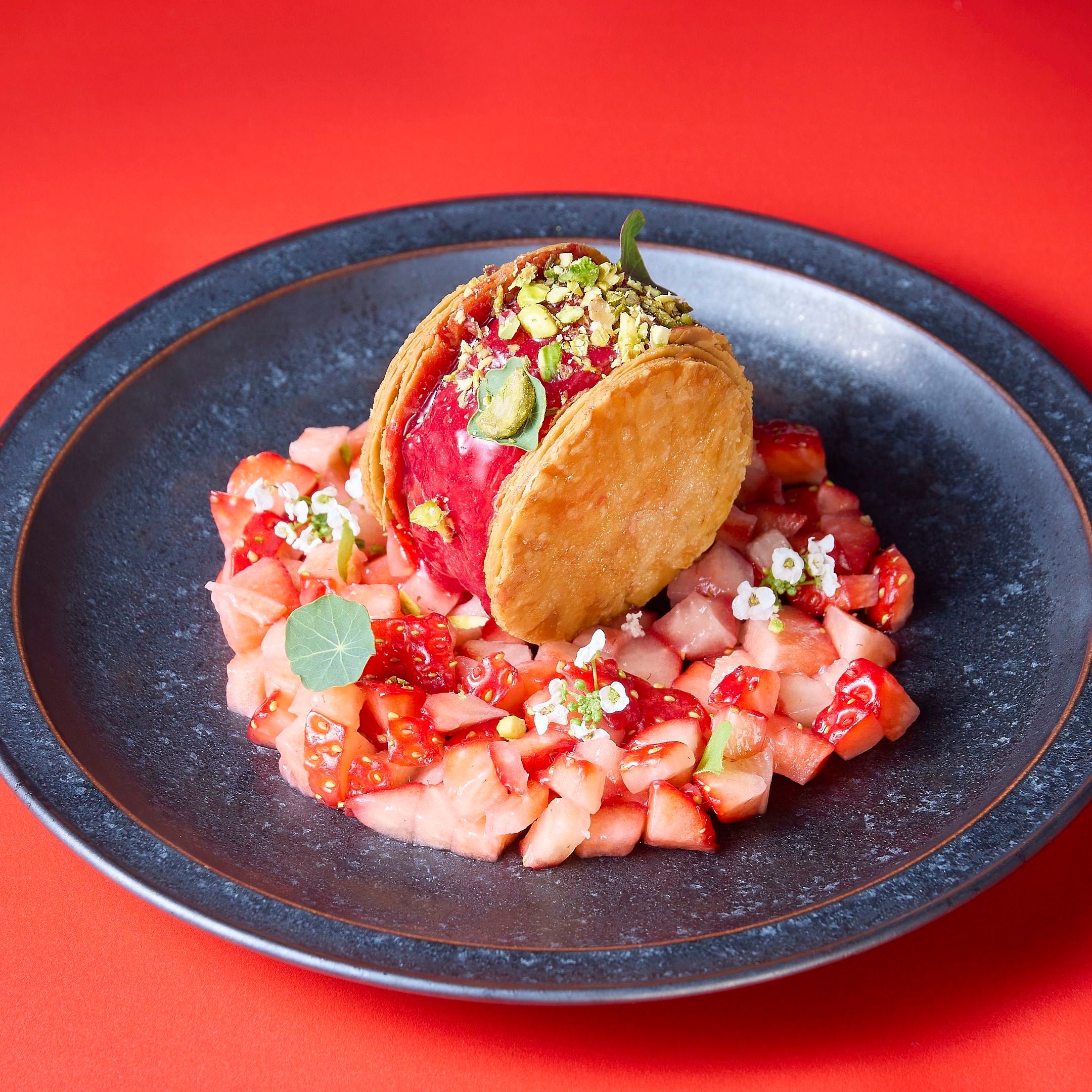 今年は“濃い”いちごが熱い!シェフが厳選した味わいの濃いいちごをふんだんに使用し、さくさくしたパイ生地でいちごとベリーのソースでコーティングしたアイスクリームをサンド。さくさく、とろ~り、ジューシーと、さまざまな食感が楽しめます。