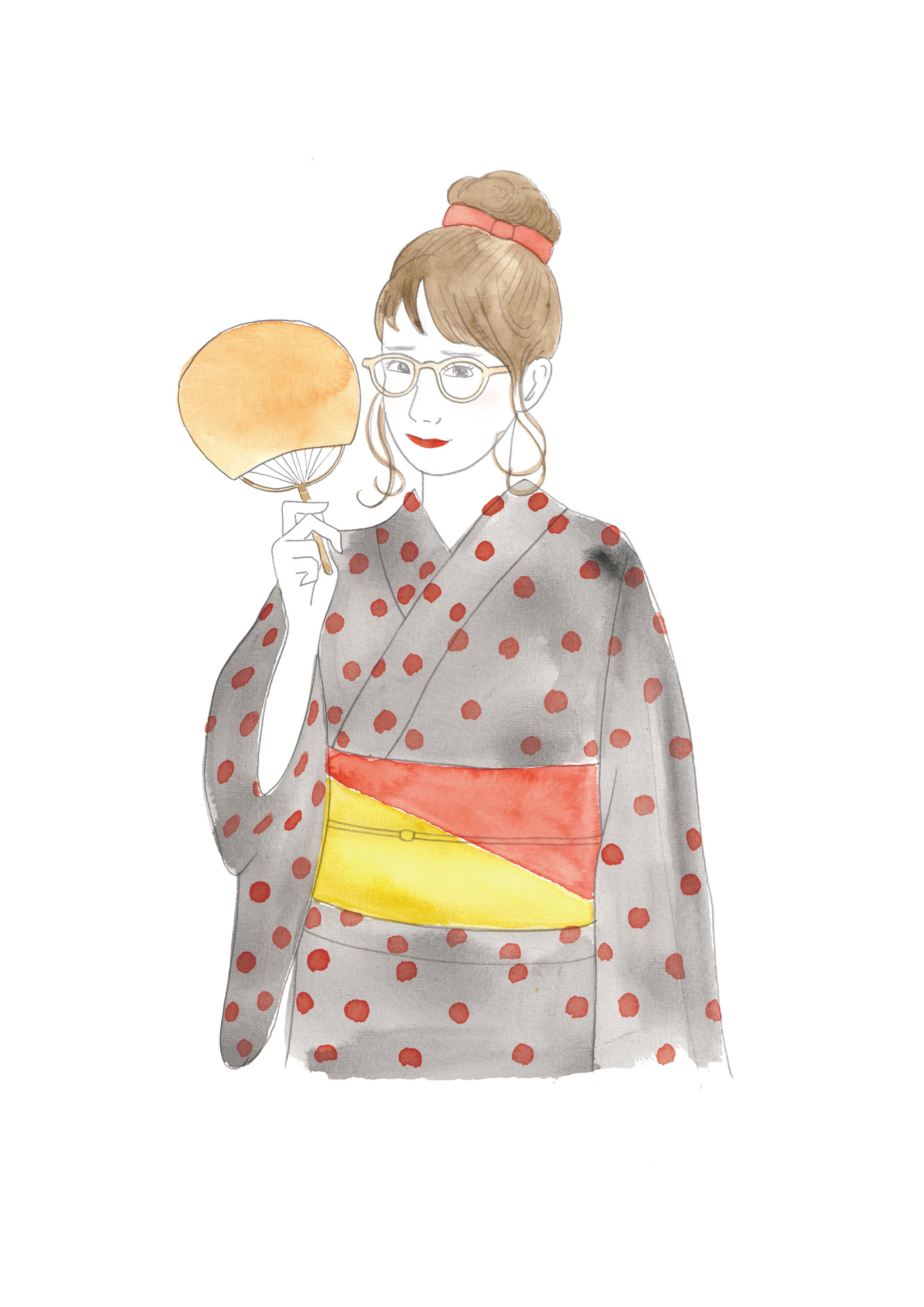 ドット柄のレトロな浴衣には、カジュアルな太縁で重くなり過ぎない透け感のあるクリアなフレームがおすすめ!