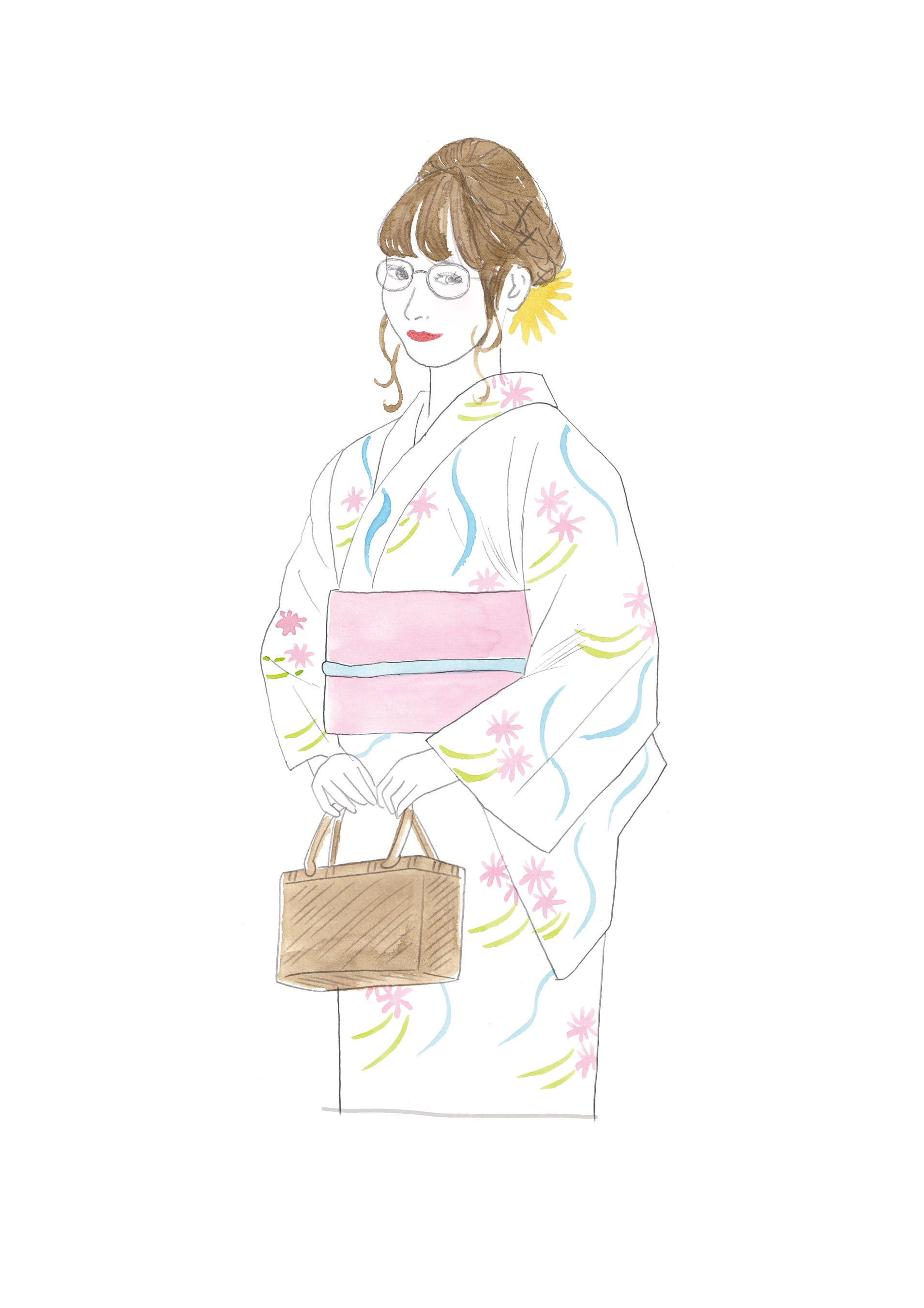☑ メガネのカラーや素材は、浴衣・帯以外に小物(かご・髪飾りなど)・髪色とのトーンとも合わせる