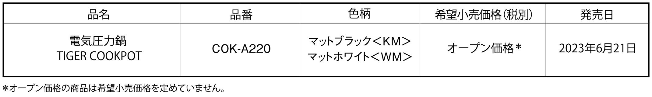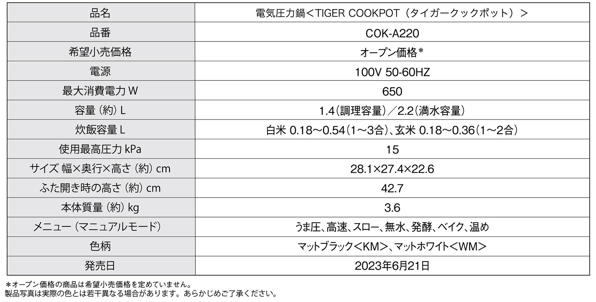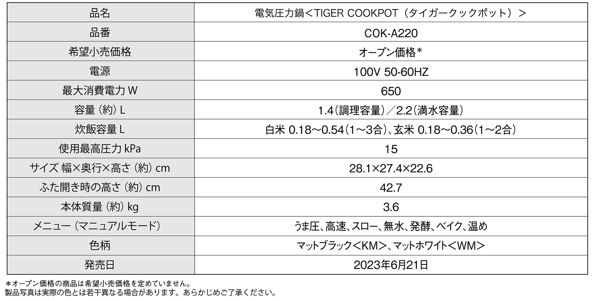 熱制御テクノロジーで世界をリードするタイガー魔法瓶株式会社(社長:菊池嘉聡、本社:大阪府門真市)は100周年記念モデル・電気圧力鍋「TIGER COOKPOT COK-A220」を2023年6月21日より発売いたします。