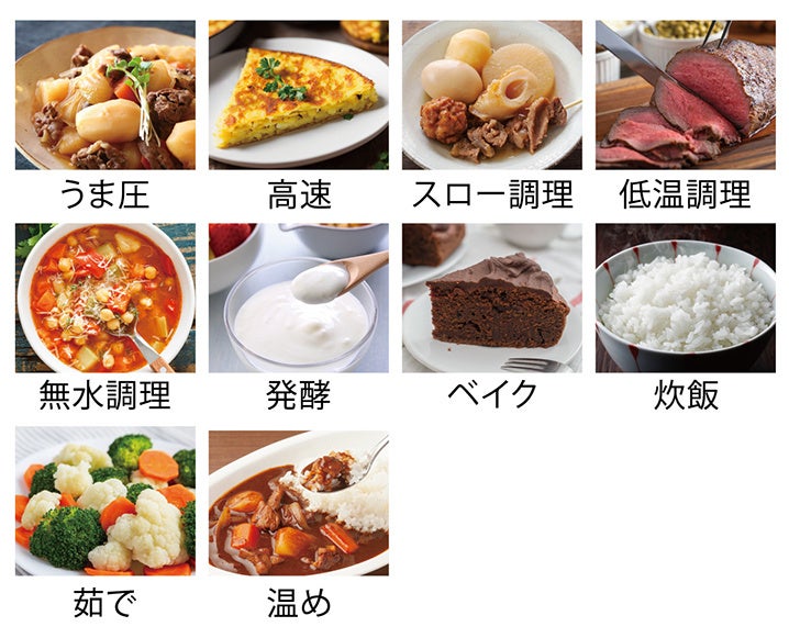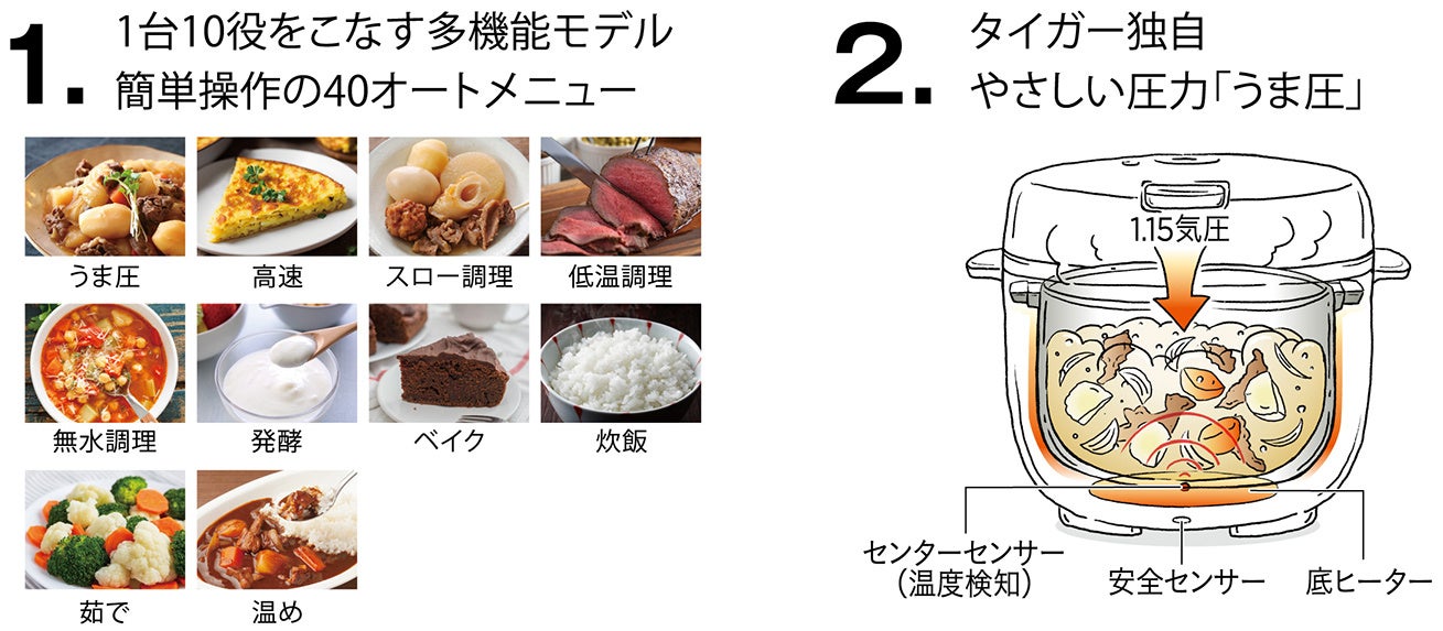 また、ジャー炊飯器の開発で約50年間培ってきた熱コントロール技術と調理ノウハウにより、肉じゃがや豚の角煮、ローストビーフなどの定番メニューをはじめ、発酵やスイーツなど、簡単操作の40オートメニューを搭載しています。さらに、タイガーレシピポータルサイト(https://www.tiger.jp/feature/recipe/)に掲載しているメニューを合わせると、100種類以上のレシピを作ることが可能です。