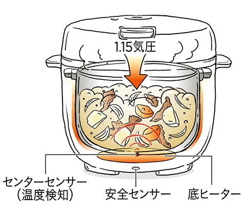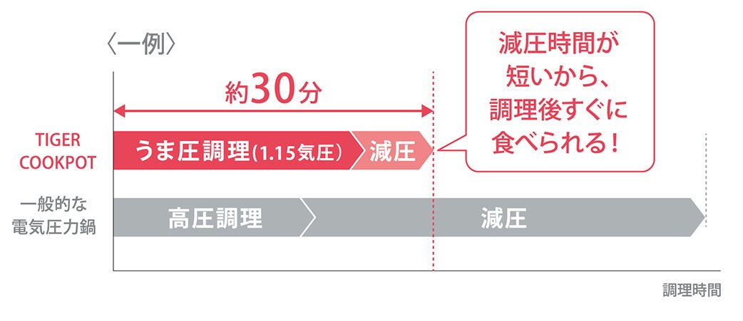 「うま圧」メニューでは、やさしい圧力(約1.15気圧)を長くかけることで、おいしく調理を行った後は約7分で減圧を完了。