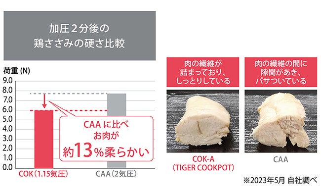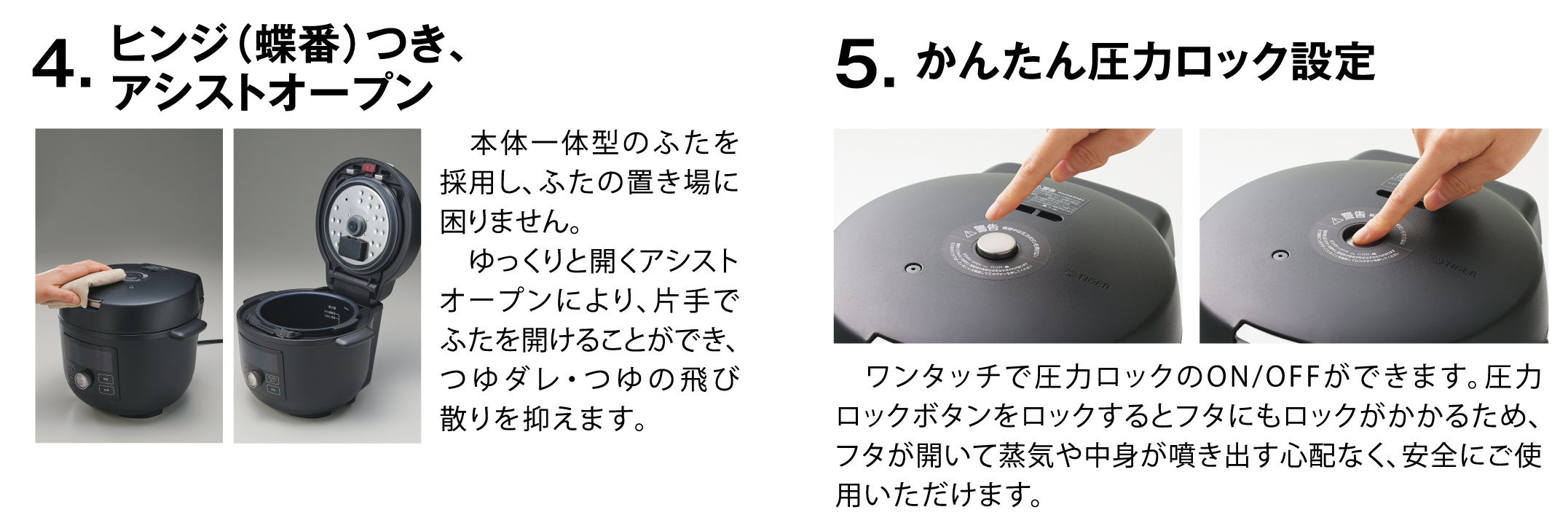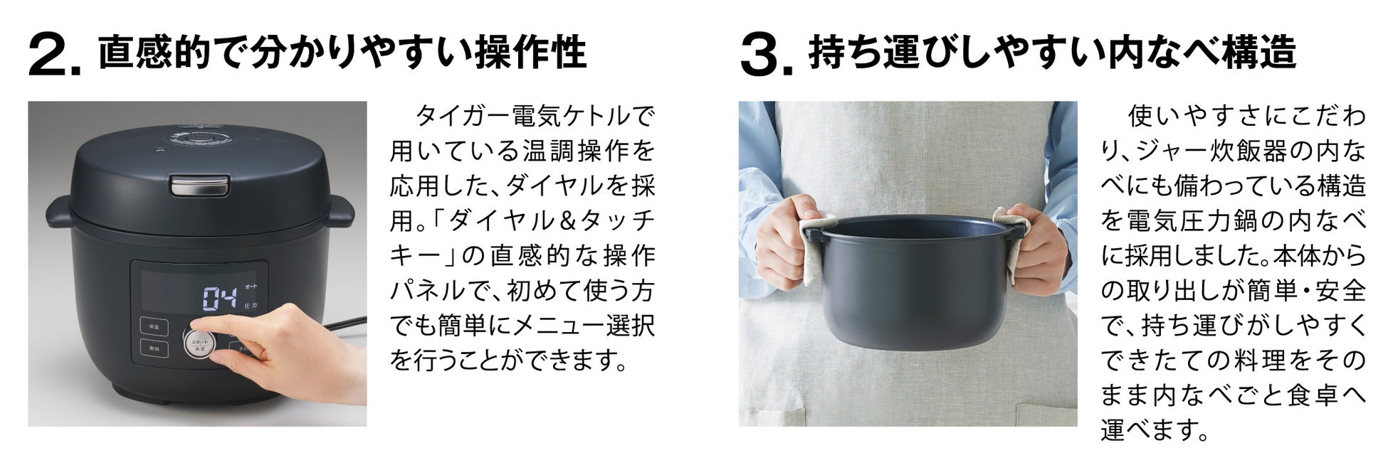タイガー魔法瓶は、主力商品のひとつである圧力炊飯器の温度コントロール技術を活かし、約20年ぶりに電気圧力鍋の開発に挑戦しました。20代~30代の共働き・子育て世帯をターゲットに定め、“料理を一番楽しい家事にしたい。”をコンセプトに、「使いやすさ」に徹底的にこだわった要素開発を実施。その結果、圧力の高さが重視される電気圧力鍋がトレンドの中、本当の使いやすさにこだわり、約1.15気圧(うま圧)を採用いたしました。これにより、圧力調理後の減圧で待たされる時間を短縮できることに加えて、食材の食感や栄養などおいしさを保つ調理が可能です。